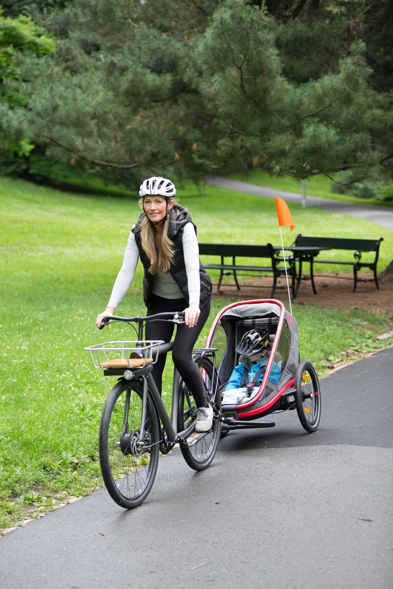 Vognen kan enkelt slås sammen flatt, og hjulene tas av med hurtigutløsning for enkel transport og lagring. Safe Connection Point gjør det raskt og trygt å bytte mellom sykkelarm, barnevognhjul, joggehjul (kjøpes utenom) eller skisett (følger med)