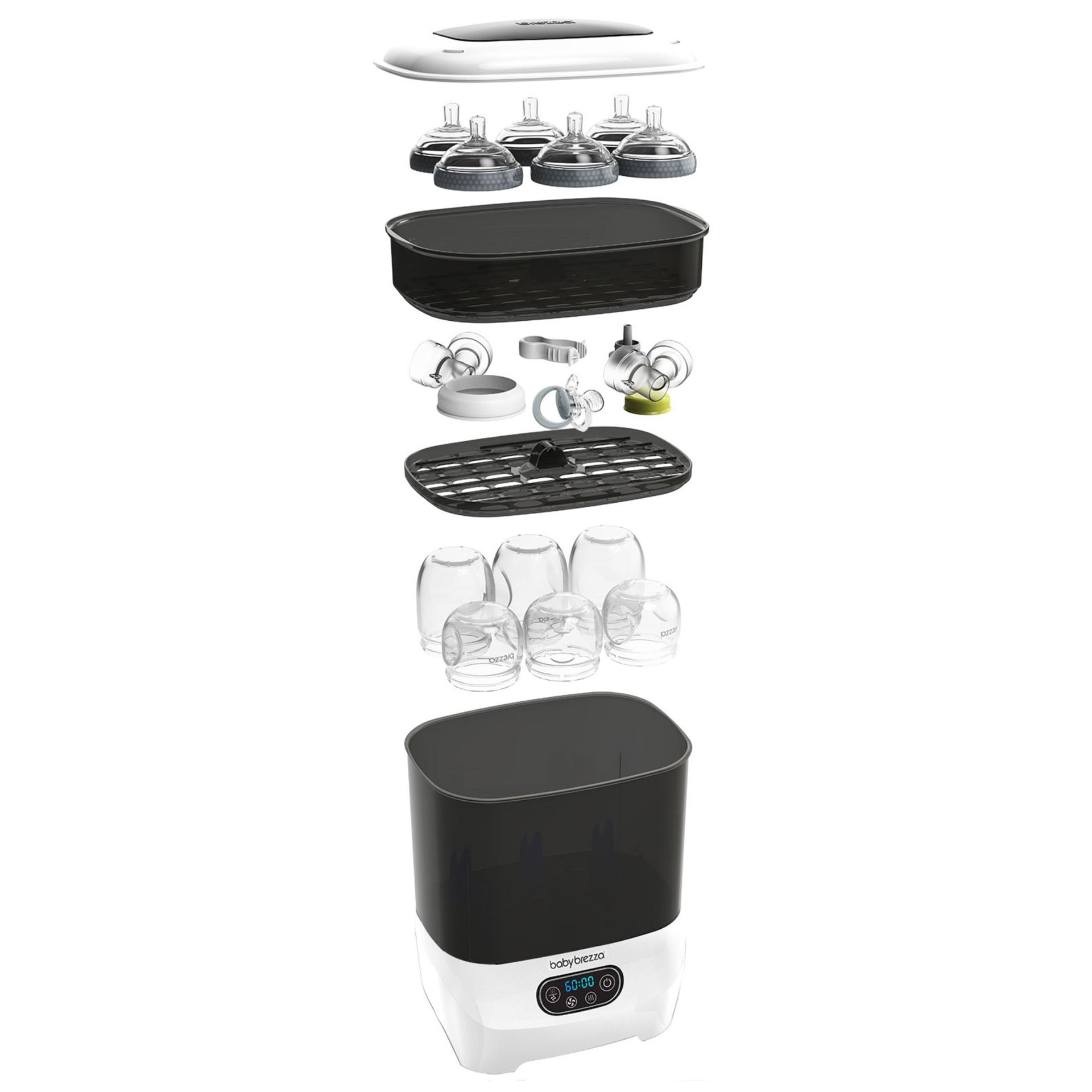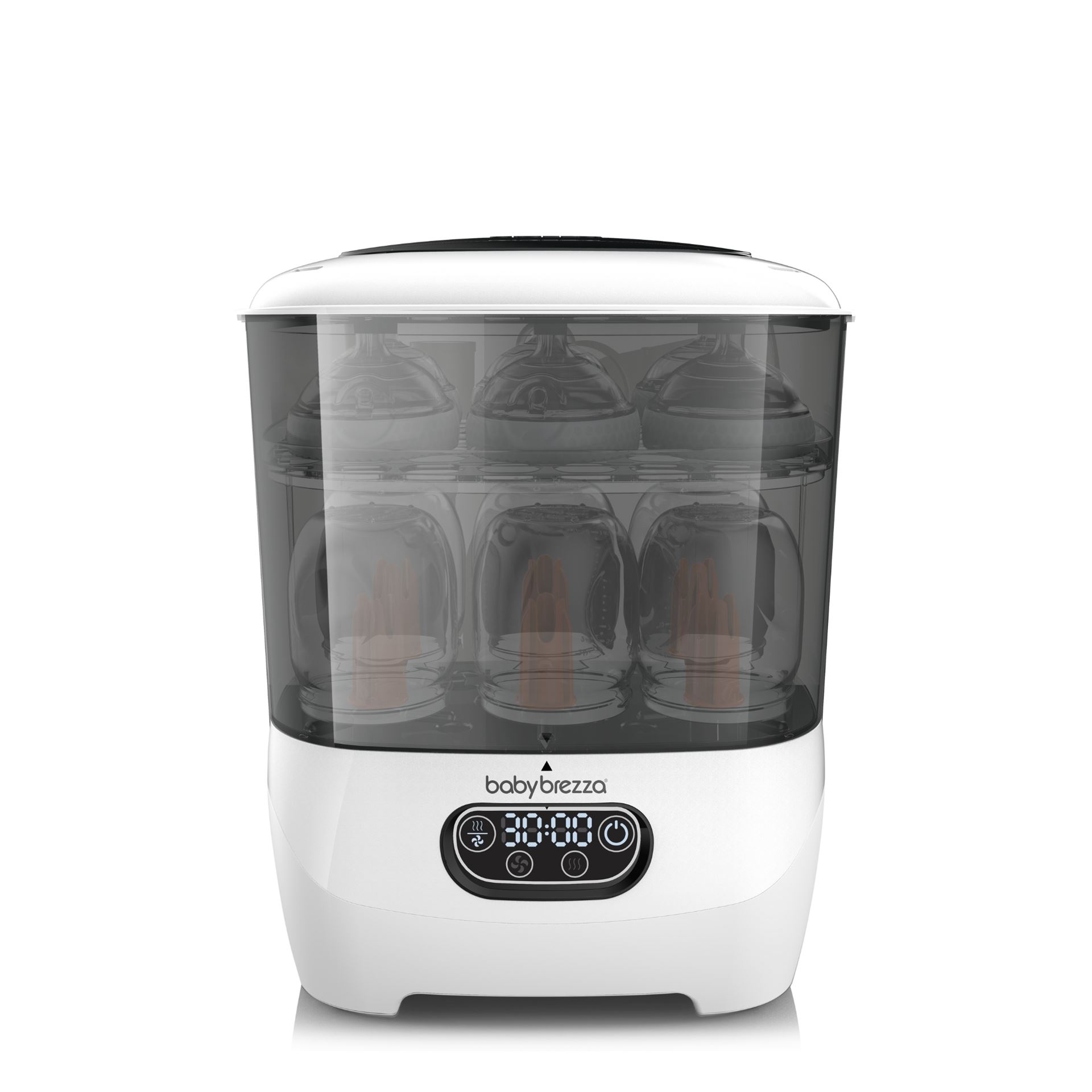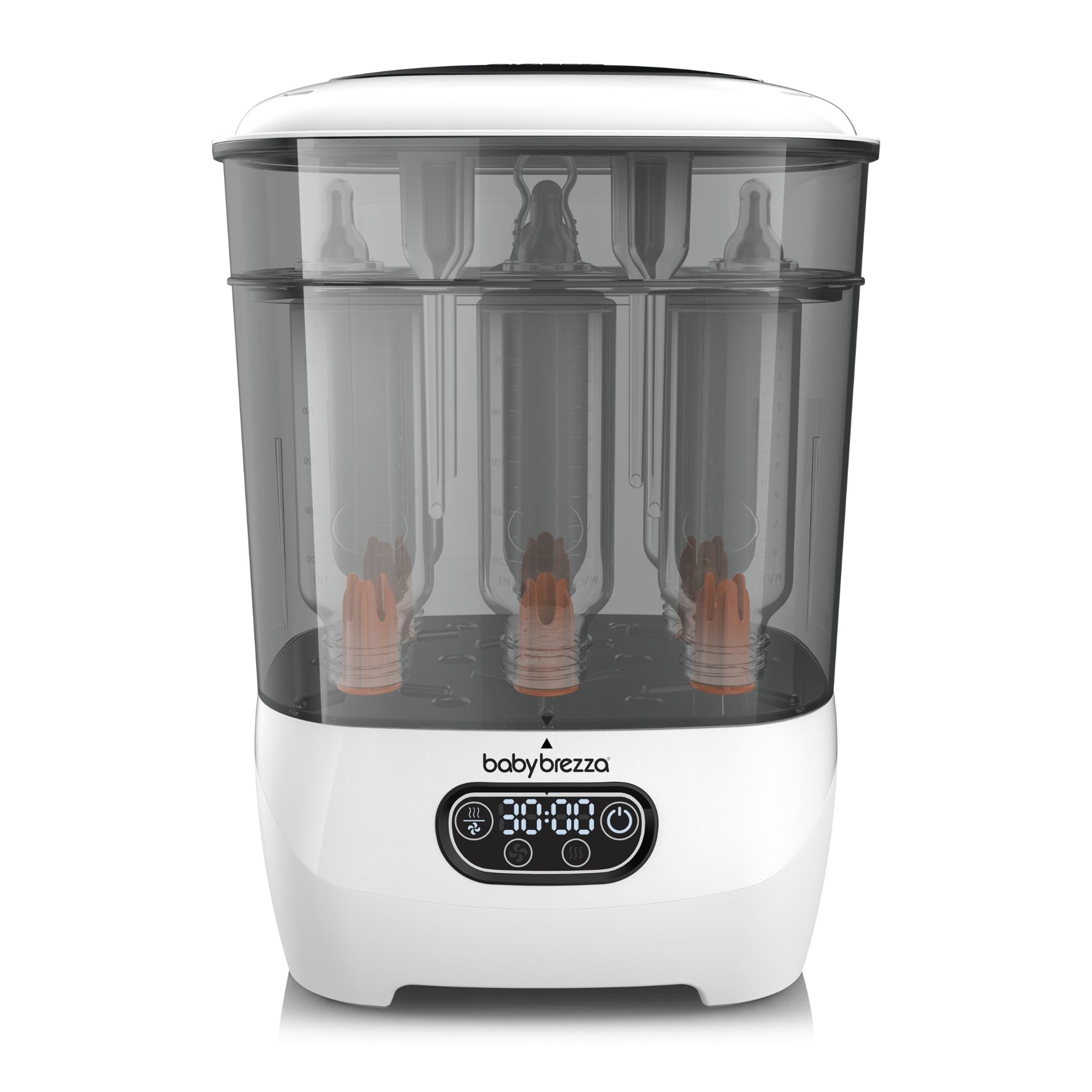 Den bruker naturlig damp for å drepe 99,9% av bakteriene, og tørker automatisk 33% raskere enn andre sterilisatorer. Du kan velge mellom fire ulike funksjoner: steriliser og tørk, bare steriliser, bare tørk eller oppbevaringssystem. Den har den største kapasiteten av alle sterilisatorer – den rommer 8 flasker, 2 fulle pumpedelsett og tilbehør fra alle merker. Den har også et utskiftbart HEPA-filter som sørger for at den tørker med 95% bakteriefri luft