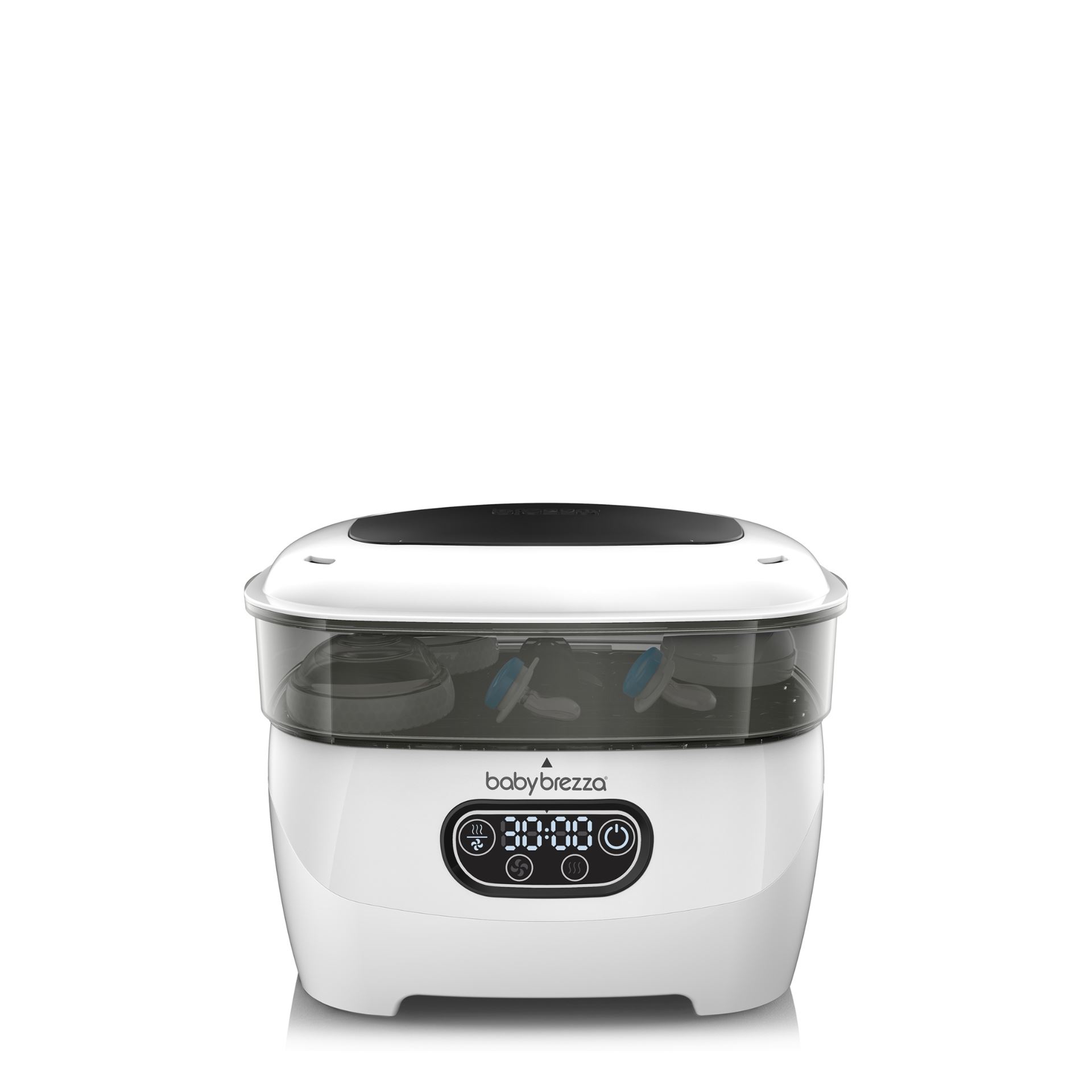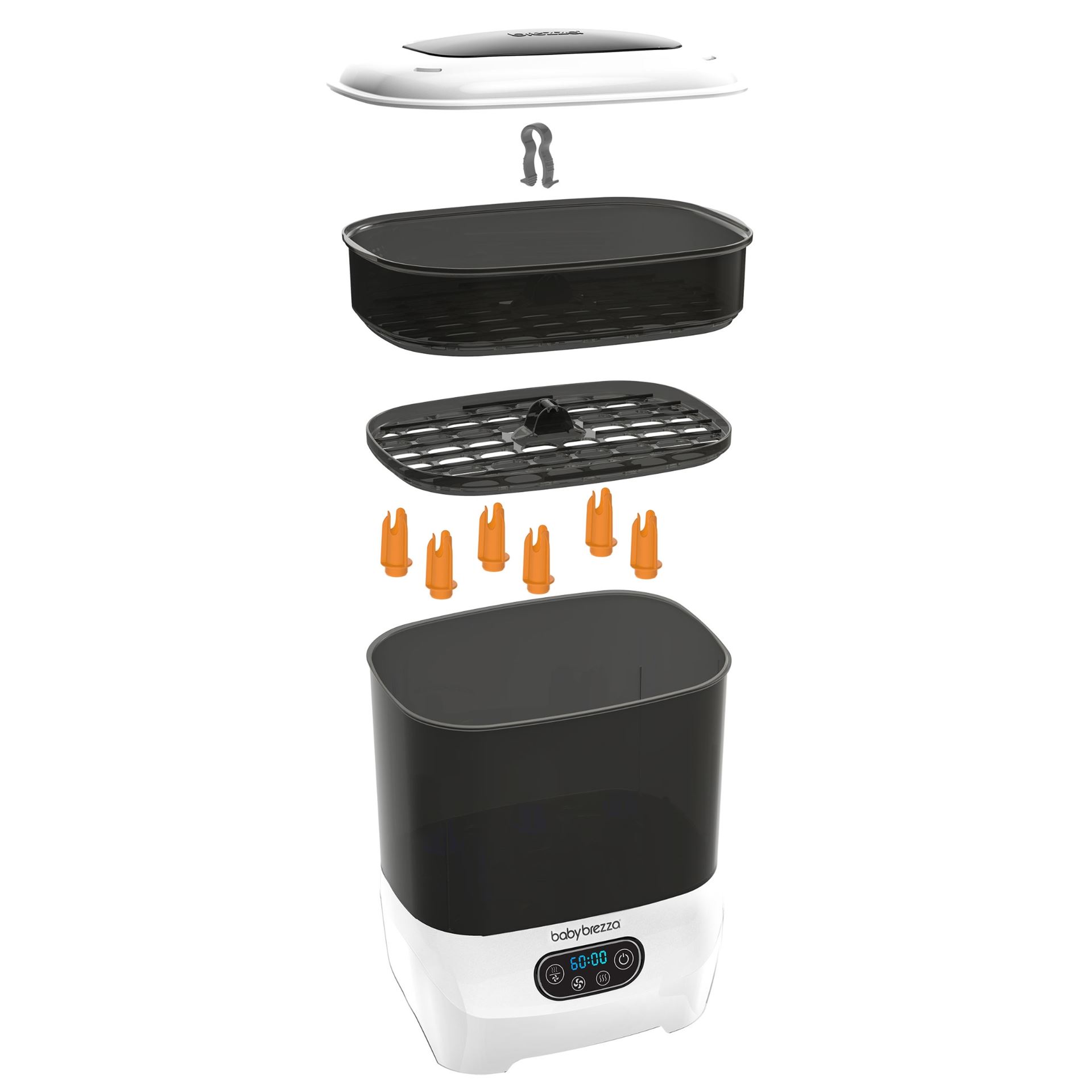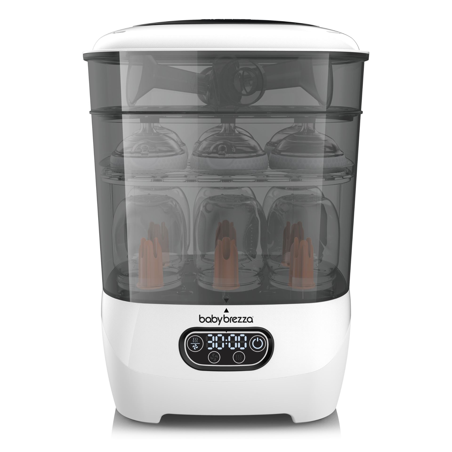 Den bruker naturlig damp for å drepe 99,9% av bakteriene, og tørker automatisk 33% raskere enn andre sterilisatorer. Du kan velge mellom fire ulike funksjoner: steriliser og tørk, bare steriliser, bare tørk eller oppbevaringssystem. Den har den største kapasiteten av alle sterilisatorer – den rommer 8 flasker, 2 fulle pumpedelsett og tilbehør fra alle merker. Den har også et utskiftbart HEPA-filter som sørger for at den tørker med 95% bakteriefri luft