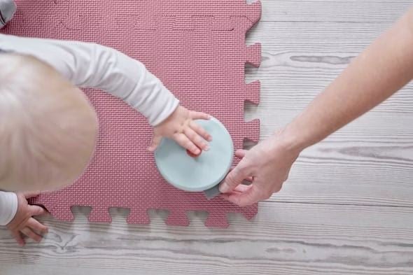 Lekegulv i skum fra BabyDan, laget i giftfritt skum som demper lyd og isolerer mot kalde gulv. Hver bit er 30x30cm, 9 biter som totalt blir 90x90cm.