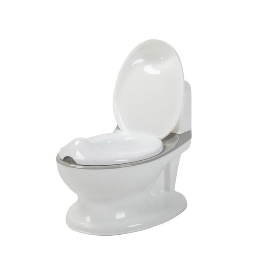 Bli kvitt bleiene med en toalettrener som gjør det lettere og morsommere å bli tørr! Toalettreneren ser ut som et ekte toalett med skyllelyd og plass til toalettpapir på baksiden, og gir barnet en følelse av å gå på toalettet som en voksen Toalettskålens separate skål gjør det enkelt å tømme og rengjøre. Den sklisikre basen gir barnet en trygg opplevelse. Batterier er ikke inkludert.