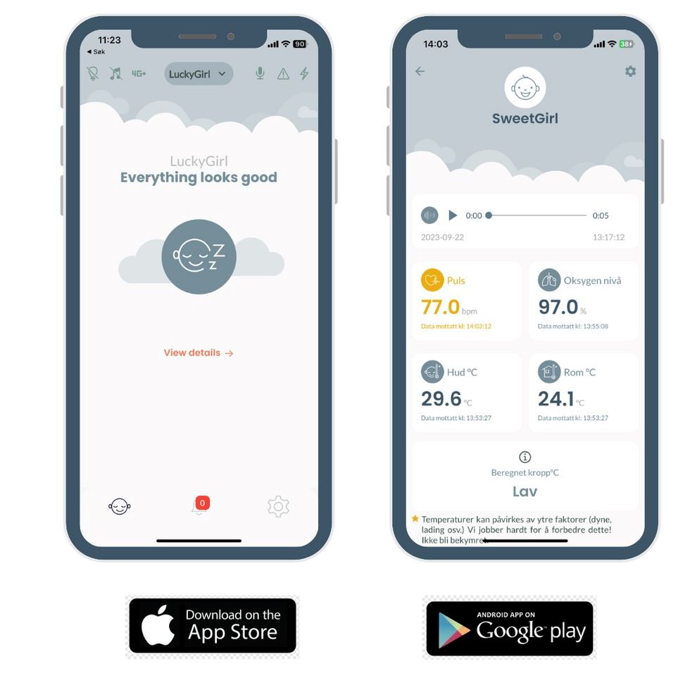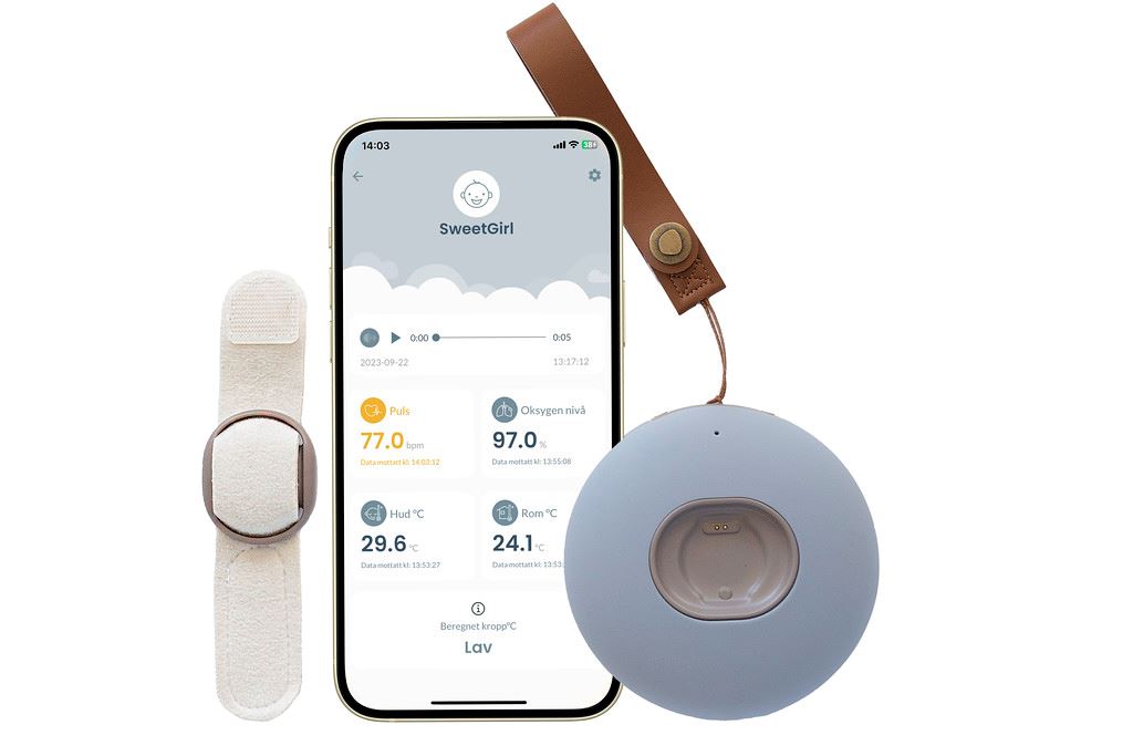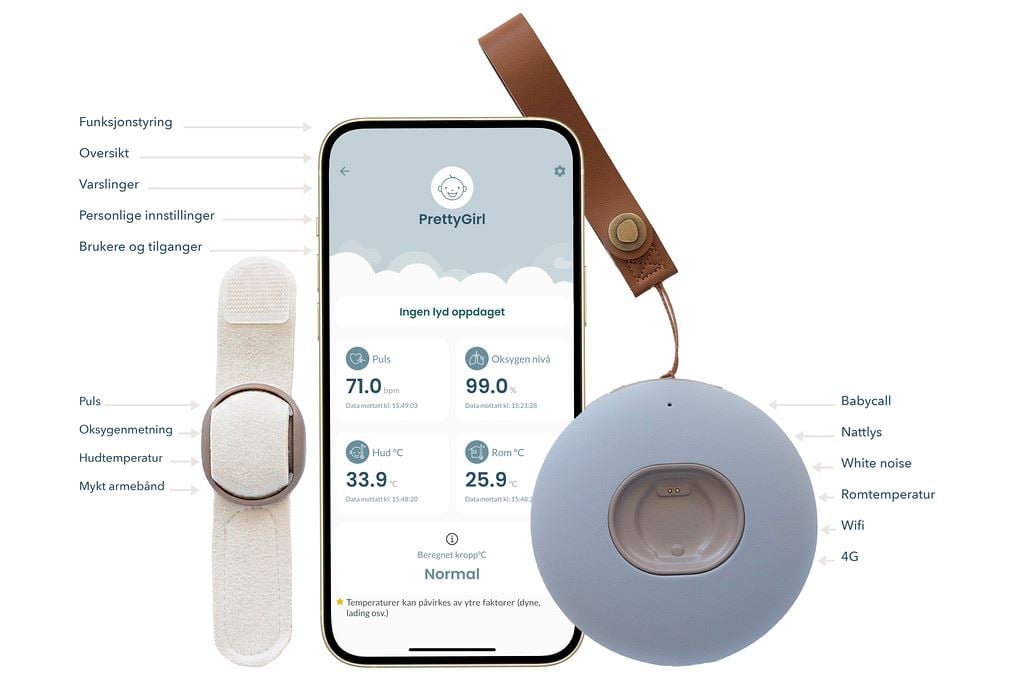 - Armbåndsensor: Behagelig og trygg for babyen å ha på håndleddet eller foten.