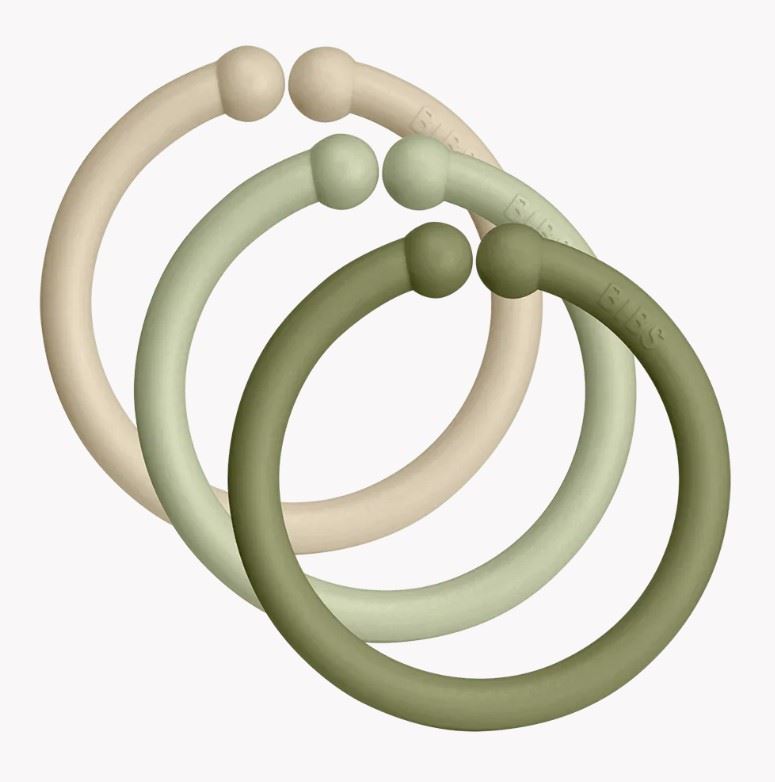 Bibs Loops er en smart og funksjonell babyleke som består av 12 fleksible ringer i fargene Vanilla, Sage og Olive. Ringene kan festes sammen eller brukes hver for seg, og gir utallige muligheter til lek og praktisk bruk. Lag en smokkesnor, heng opp rangler og bamser i babygym eller vogn, eller la barnet utforske ringene som biteleke. Bibs Loops er laget av 100 % matsikkert materiale, helt fri for BPA, PVC og ftalater, og er nøytral i smak og lukt. Designet og produsert i Danmark med fokus på trygghet og minimalistisk funksjonalitet.