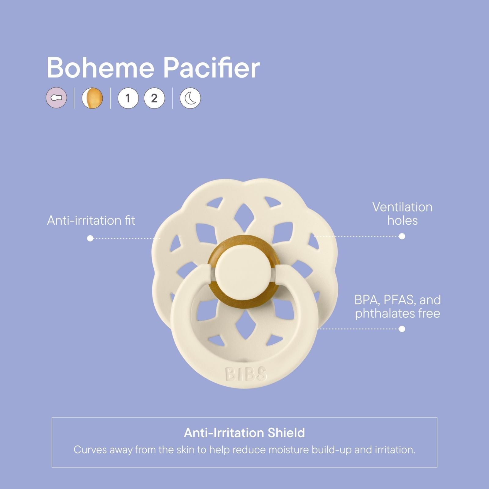 Bibs Boheme er basert på den klassiske Bibs smokken, og er laget av naturgummi . men har et mer spennende smokkeskjold for utseendets skyld. Lengde og fasong er utviklet med tanke på å tilfredsstille barnets sugerefleks. Smokkene er 100 % fri for BPA og PVC, og er produsert i Danmark. Bibs Denmark er et familieeid firma som har produsert smokker i over 40 år, anbefalt av fagfolk og kjent for sitt design, farger og kvalitet.