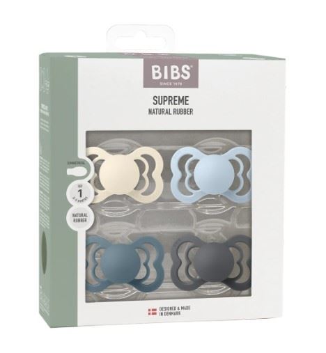 Bibs Supreme 4‑pak i fargene Ivory, Baby Blue, Petrol og Iron er ergonomiske smokker i størrelse 1, utviklet for å gi maksimal komfort til nyfødte og små babyer. Den symmetriske latexsutten legger seg naturlig i babyens munn, mens de store ventilasjonsåpningene sørger for god luftstrøm og reduserer fuktighet rundt munnen. Brystvorteventilen slipper ut luft slik at sutten former seg etter babyens munnhule, og den myke matte finishen gjør smokken behagelig i bruk gjennom hele dagen.