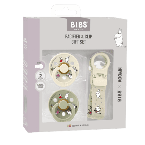 Bibs Mummitrollet smokker er laget av naturlig gummilatex med dekorert skjold. Designet og produsert i Danmark, fri for BPA og PVC. Pakken består av to smokker anbefalt for babyer og småbarn fra 6mnd+, samt en smokkesnor, levert i pen gavepakke