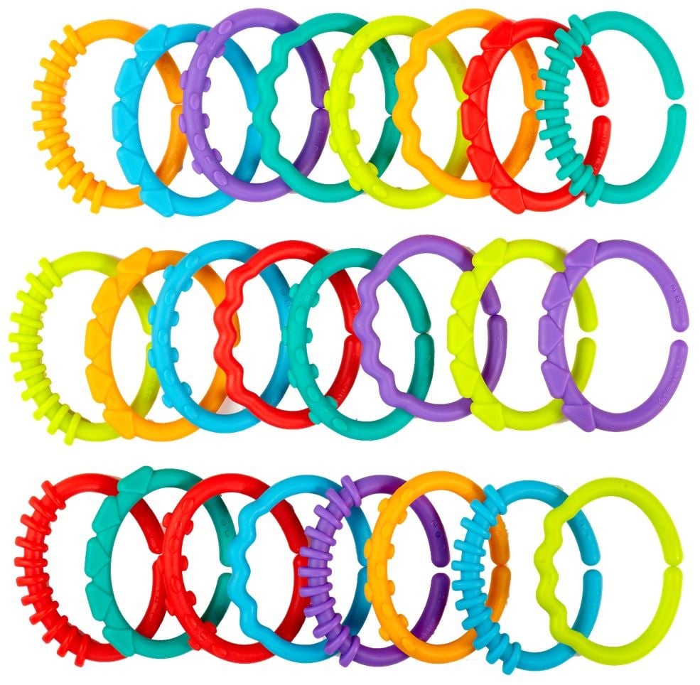 Et lekekjede med små plastikkringer som kan pusles sammen til en lang kjede. Du kan og bruke kjedet til å henge opp leker på babygym, aktivitetsstativer, barnevognen eller bilstolen.