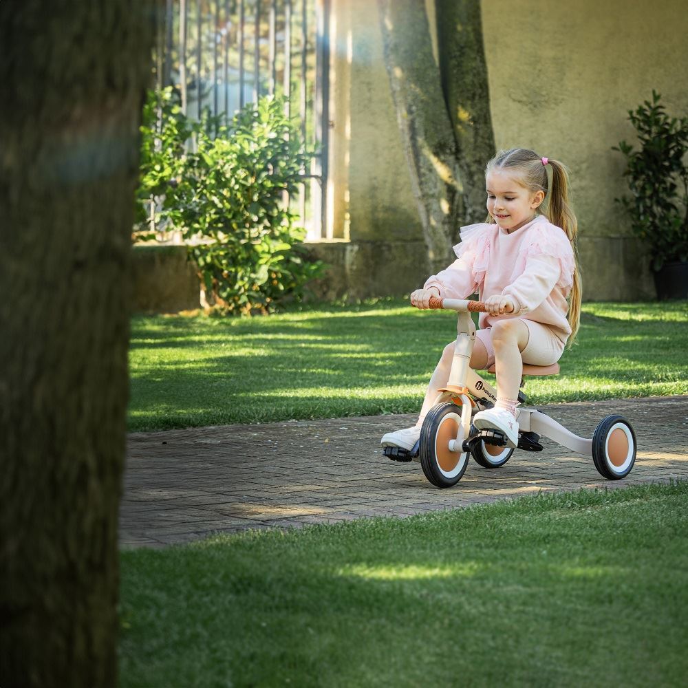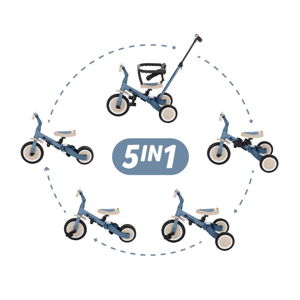 Fleksibel 5‑i‑1 trehjulsykkel som vokser med barnet. Brukes som trehjulssykkel med eller uten babysete, som balansesykkel eller som barnets første sykkel med pedaler. Med justerbart sete og håndtak passer denne alle barn fra ca 18 måneder til 5 år.