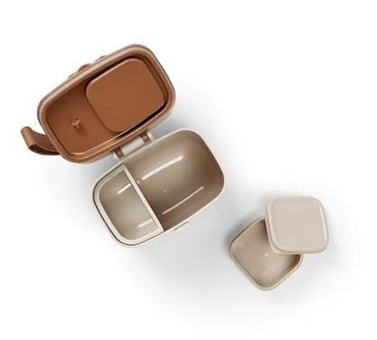Elodie Details Matboks holder maten frisk og adskilt takket være tre separate rom. Lokket har en silikonring i matsikker kvalitet som gjør boksen helt lufttett og bevarer smaken og friskheten lenger. En liten gaffel er festet på innsiden av lokket, slik at barnet alltid har bestikk tilgjengelig.