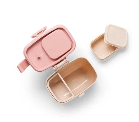 Elodie Details Matboks holder maten frisk og adskilt takket være tre separate rom. Lokket har en silikonring i matsikker kvalitet som gjør boksen helt lufttett og bevarer smaken og friskheten lenger. En liten gaffel er festet på innsiden av lokket, slik at barnet alltid har bestikk tilgjengelig.