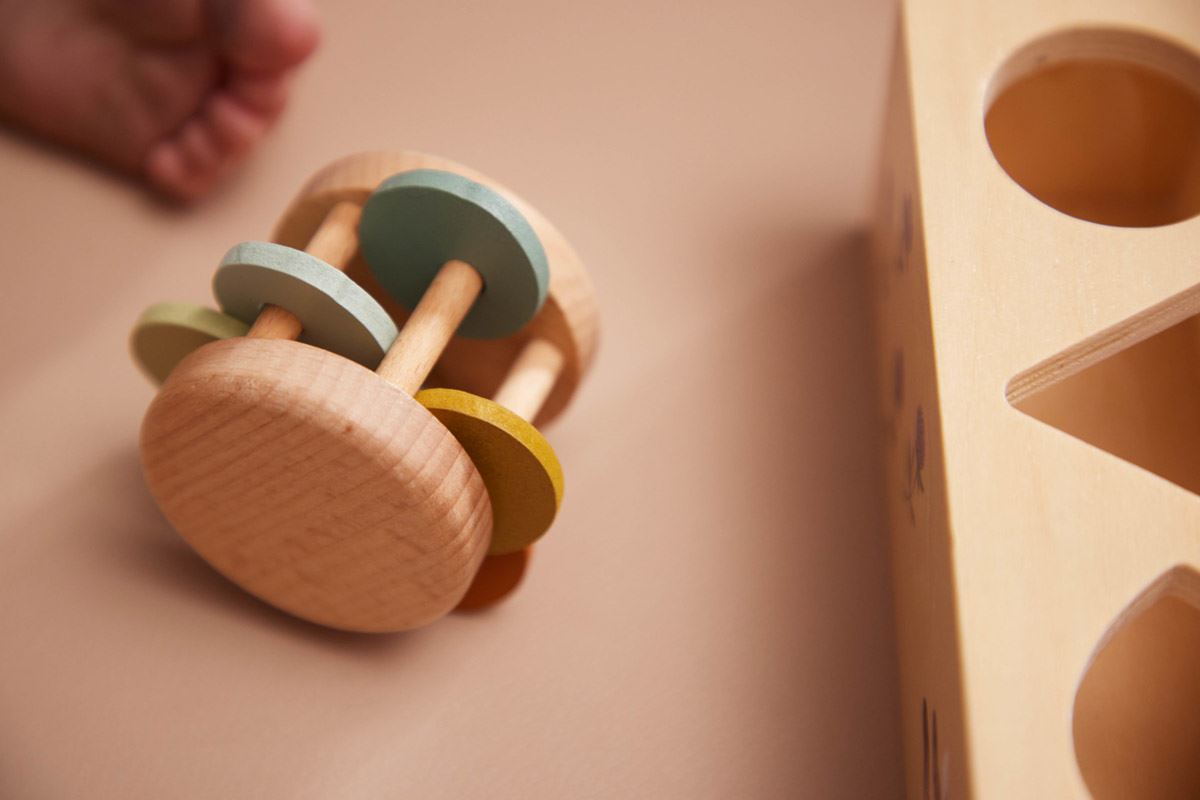 En lekekoffert fylt med fire sanseleker i bøketre - slik at barnet kan utforske lyder, farger og spennende overflater.