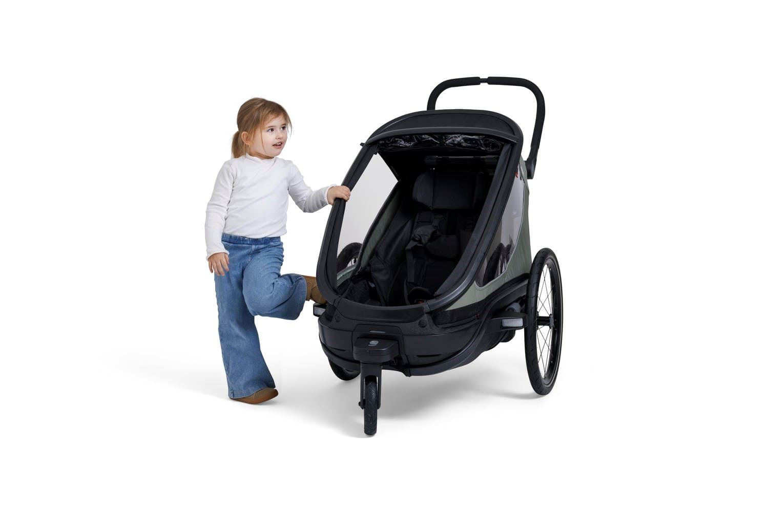 Outback Next er bygget på en robust aluminiumsramme med lavt tyngdepunkt og god stabilitet. De luftfylte hjulene og fjæringen gir en jevn og behagelig tur på både asfalt, grus og skogsstier. Setene har 5‑punkts sele, og kupeen har god plass – også når barnet bruker hjelm. Store vinduer gir utsikt og lys, mens solskjerm og netting beskytter mot vær og vind.