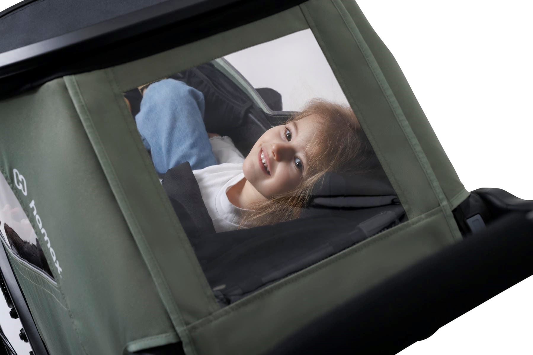 Outback Next er bygget på en robust aluminiumsramme med lavt tyngdepunkt og god stabilitet. De luftfylte hjulene og fjæringen gir en jevn og behagelig tur på både asfalt, grus og skogsstier. Setene har 5‑punkts sele, og kupeen har god plass – også når barnet bruker hjelm. Store vinduer gir utsikt og lys, mens solskjerm og netting beskytter mot vær og vind.