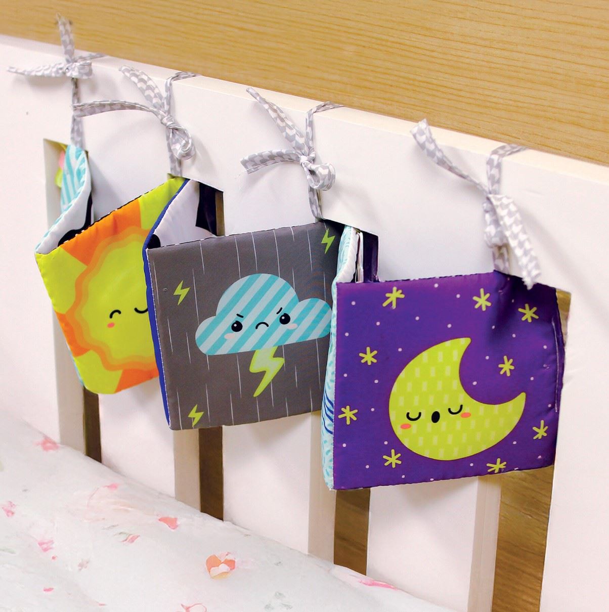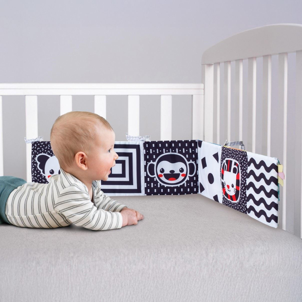 Infantino Babybok er en myk og lett aktivitetsbok designet for å støtte babyens utvikling fra første måned. Den kan brukes på flere måter – heng den i sprinkelsengen, fest den til barnevognen eller legg den foran babyen under magetid. Boken har to sider med ulike mønstre, farger og lydelementer som stimulerer syn, hørsel og berøring. Høykontrastfarger gir visuell stimulering, mens morsomme detaljer og knitrelyder oppmuntrer til utforskning og lek. Den er laget for små hender og følsomme gommer, og gir både underholdning og trøst i hverdagen.