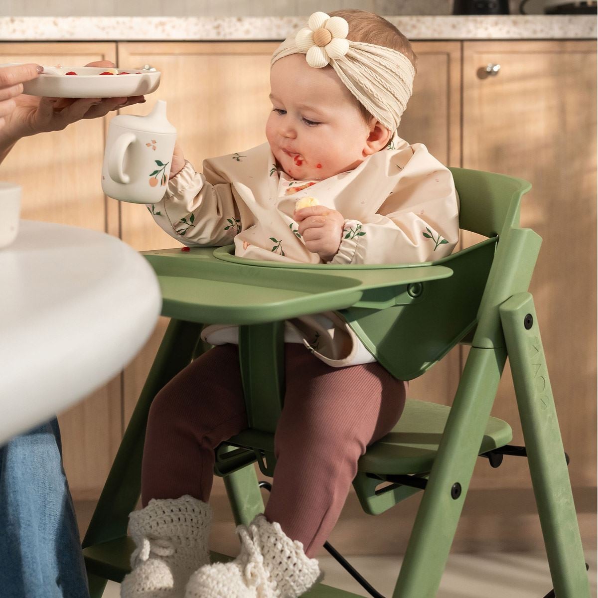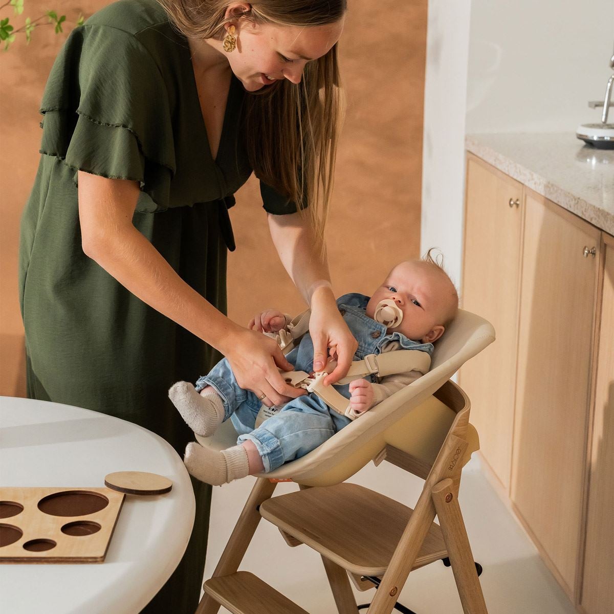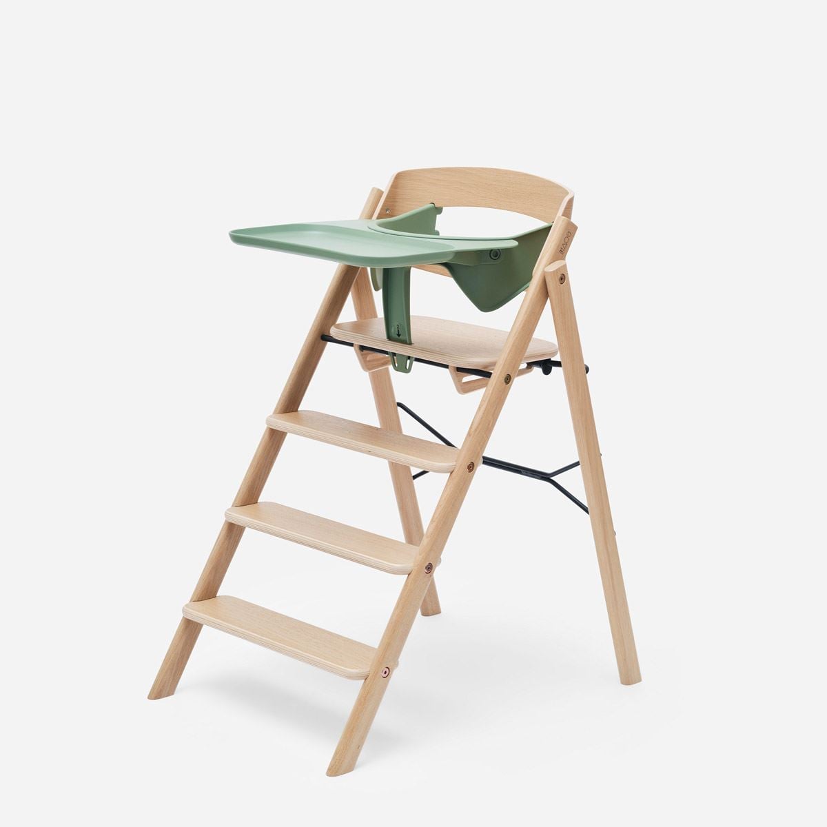 KLAPP-stolen er laget av FSC-sertifisert eik og bøk fra europeisk skogbruk og produsert i Latvia med fokus på kvalitet og holdbarhet. Den komplette pakken inkluderer nyfødtsete, bøyle, spisebrett, putesett og sele – alt designet for å gi optimal komfort og sikkerhet i alle aldre.