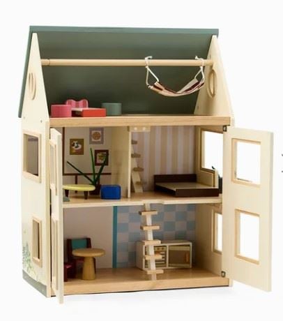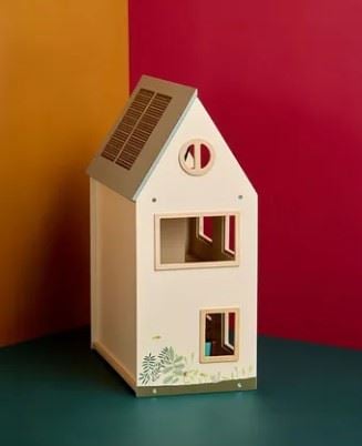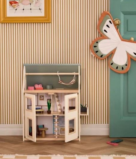 Velkommen til Aiden dukkehus – et vakkert trehus i tre etasjer, designet for barn som elsker kreativ lek og interiørdesign. Huset har solcellepaneler på taket, store vinduer og et lekerom i toppetasjen med en hengekøye. Hagen er dekorert med blomster og trær som skaper en fredelig atmosfære. Med reverserbare vegger kan barna velge mellom trykt tapet eller enkle hvite flater for å tilpasse interiøret. Dukkehuset er fullt møblert og gir mange muligheter for fantasifull lek.