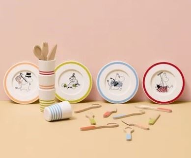 Alle delene er laget i solid treverk som ligger godt i små hender og tåler ivrig bruk. Lekeserviset passer perfekt sammen med lekekjøkken, pikniklek eller som en del av en Mummi‑inspirert lekeverden. Et flott gavevalg til barn som elsker Mummidalen og kreativ lek.