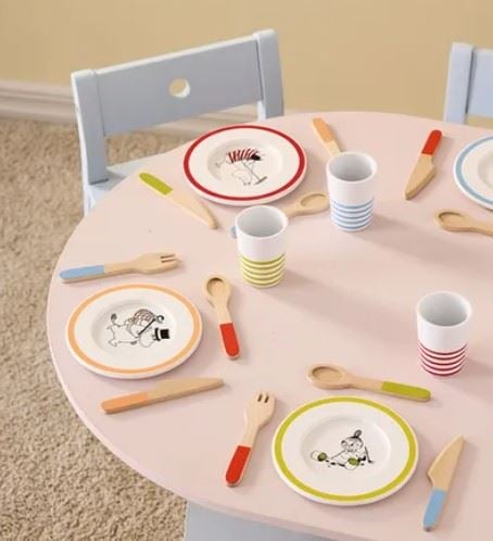 Kids Concept Lekeservise Mummi er et nydelig lekesett i FSC‑sertifisert tre, dekorert med klassiske Mummi‑illustrasjoner som inspirerer til kreativ rollelek. Settet består av fire av hver del – tallerken, kopp, gaffel, kniv og skje – slik at barnet kan dekke på til venner, bamser eller hele Mummifamilien. Perfekt for små kokker som elsker å servere, late som og skape sine egne små historier.