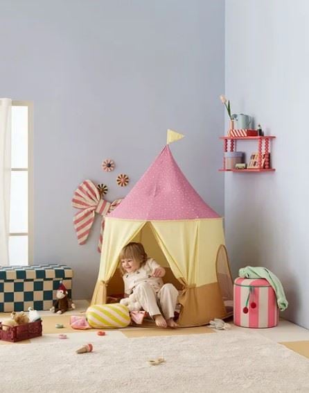 Kids Concept Sirkus Leketelt i rosa gir barnet et koselig sted å leke, lese eller trekke seg tilbake. Teltet åpner seg automatisk når det tas ut av bærevesken, og de svakt innoverlente veggene skaper en lun og trygg atmosfære inspirert av klassiske sirkustelt. Det myke polyesterstoffet i koordinerte blokkfarger kombinert med et prikkemønstret tak gir teltet et moderne og harmonisk uttrykk som passer inn i alle rom.