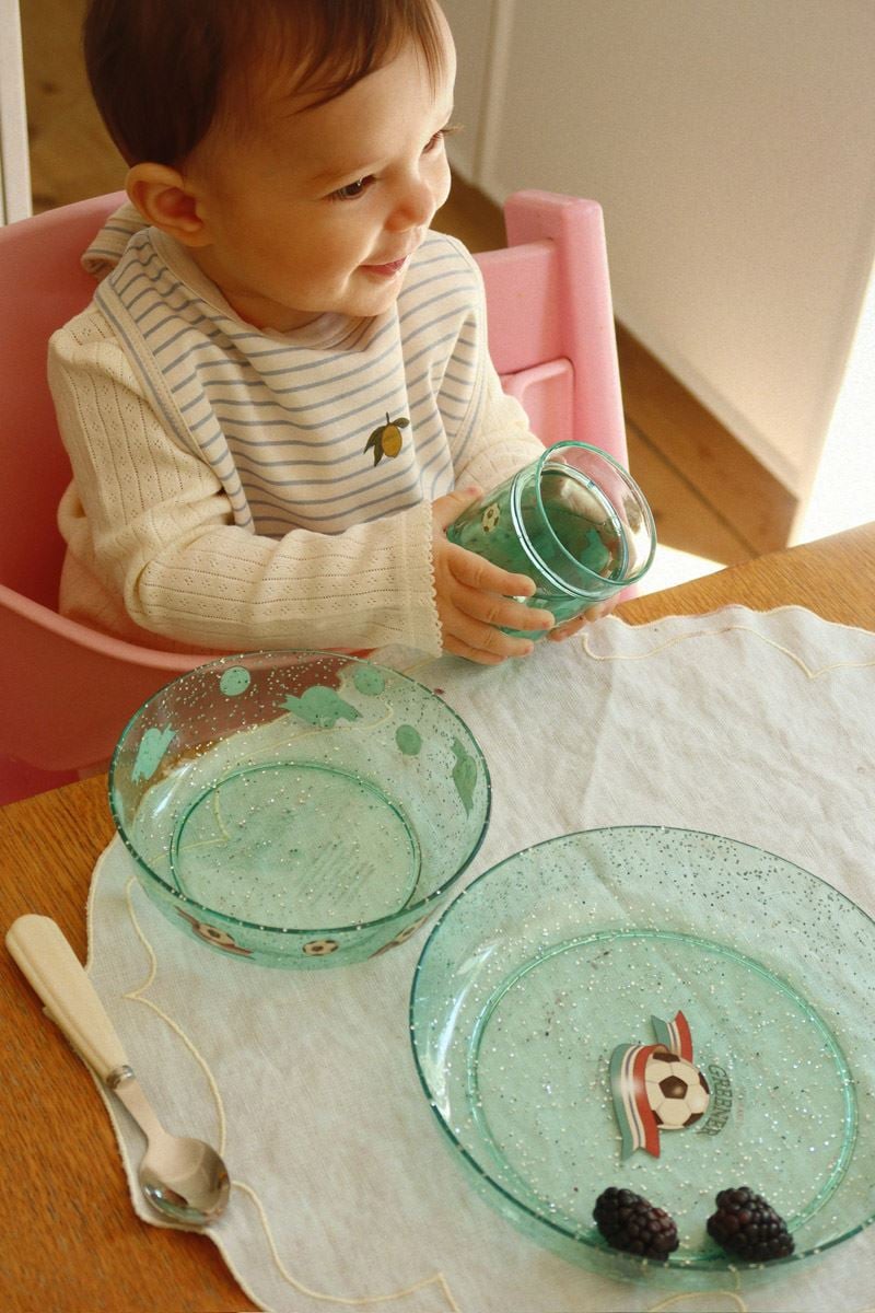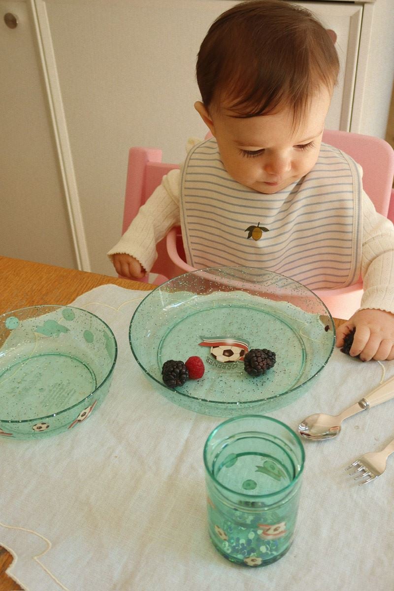 Dekorativt og slitesterkt barnebestikk i rustfritt stål med PCTG-håndtak. Inneholder åtte deler og passer fra 6 måneder.