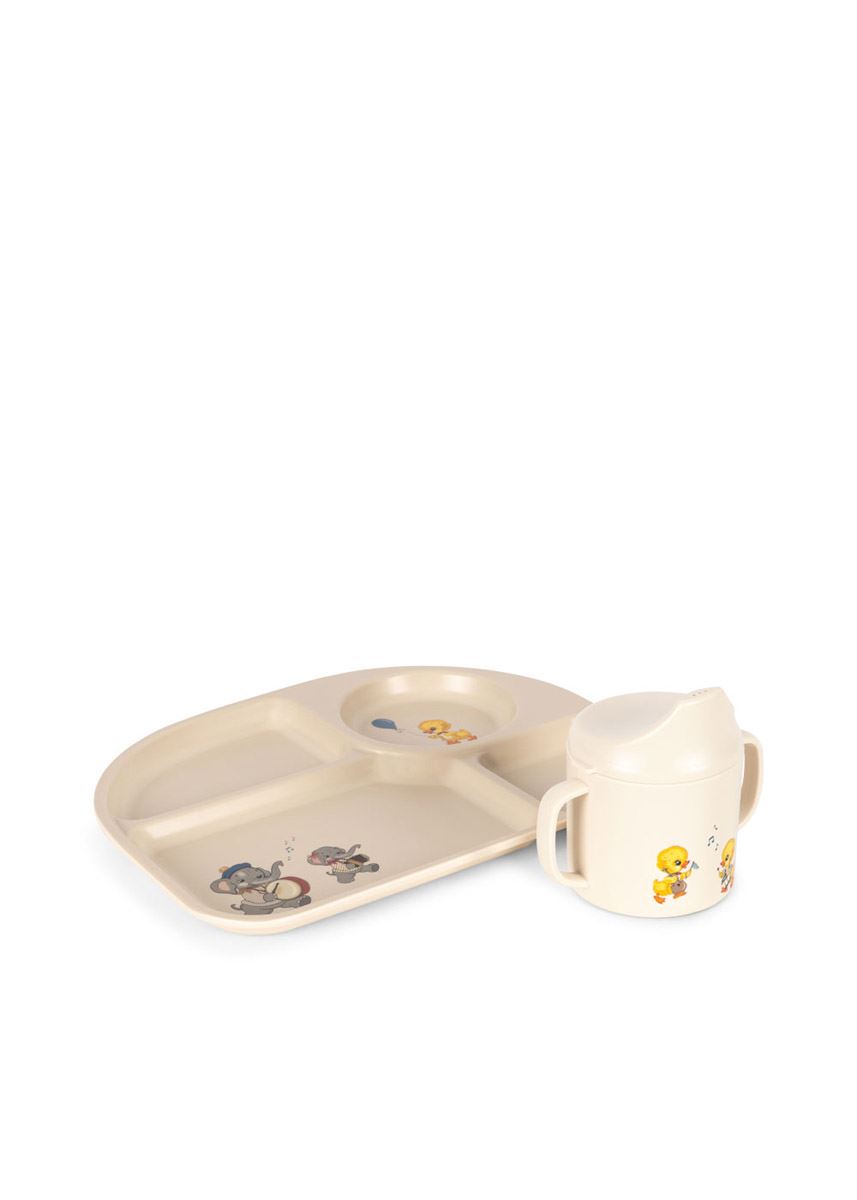 Søtt og praktisk middagssett for babyens første måltider, med lekkasjesikker tutekopp og tallerken med seksjoner. Trygge materialer og perfekt fra 6 måneder.