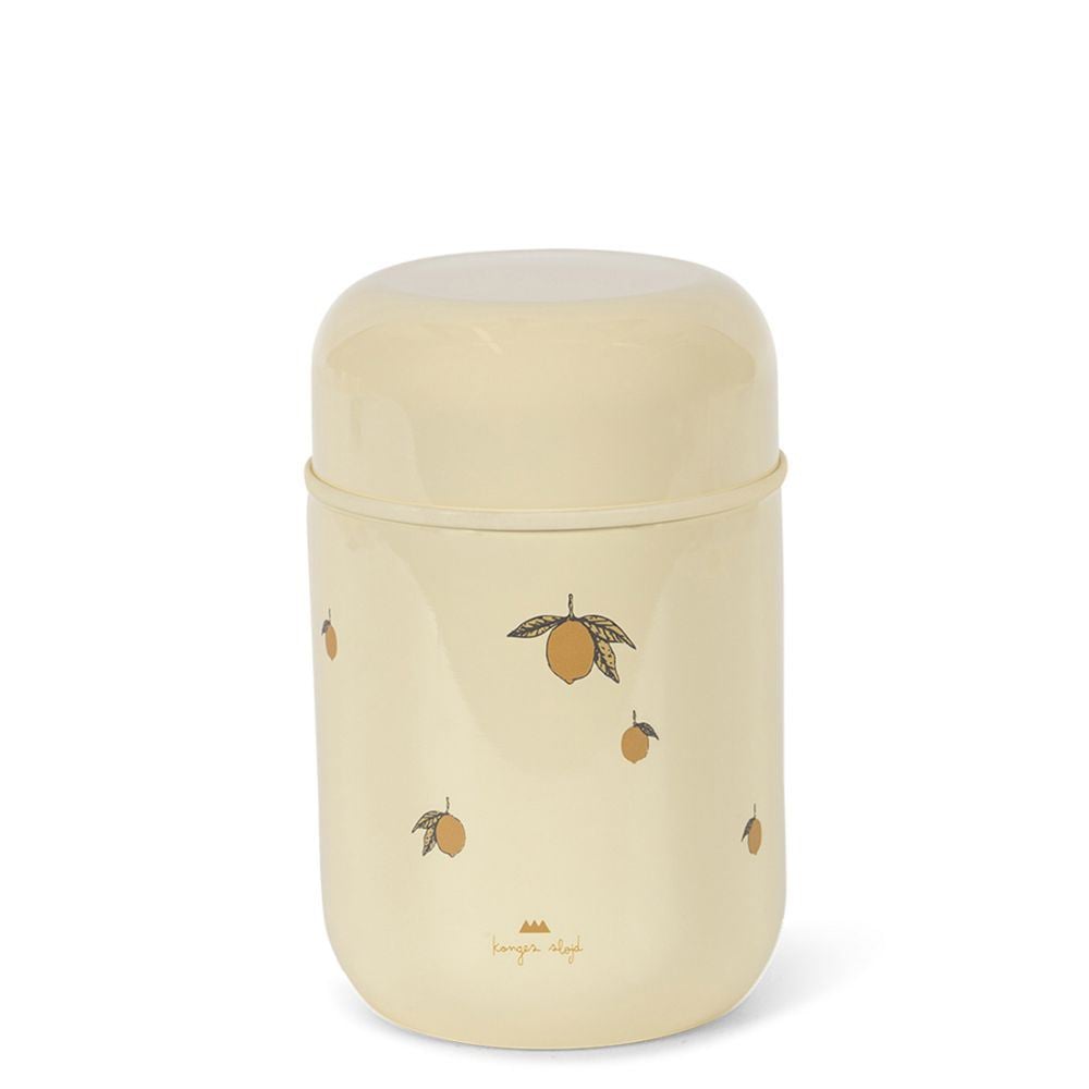 Her får dere vår nydeligste thermo matboks fra Kongens Sløyd, laget i rustfritt stål og med flott sitronmønster som barna elsker. Den har skrulokk med skje festet på, og en silikonforsegling som hindrer lekkasje. Perfekt til yoghurt, fruktsalat eller små måltider på tur. Passer fra 18 måneder.