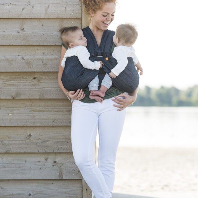 Twin Carrier kombinerer fordelene fra et tradisjonelt sjal med brukervennligheten til en moderne bæresele. Babyene sitter oppreist mot magen, med støtte for nakke og rygg. Den er enkel å justere, lett å ta på, og passer både nyfødte og større babyer.