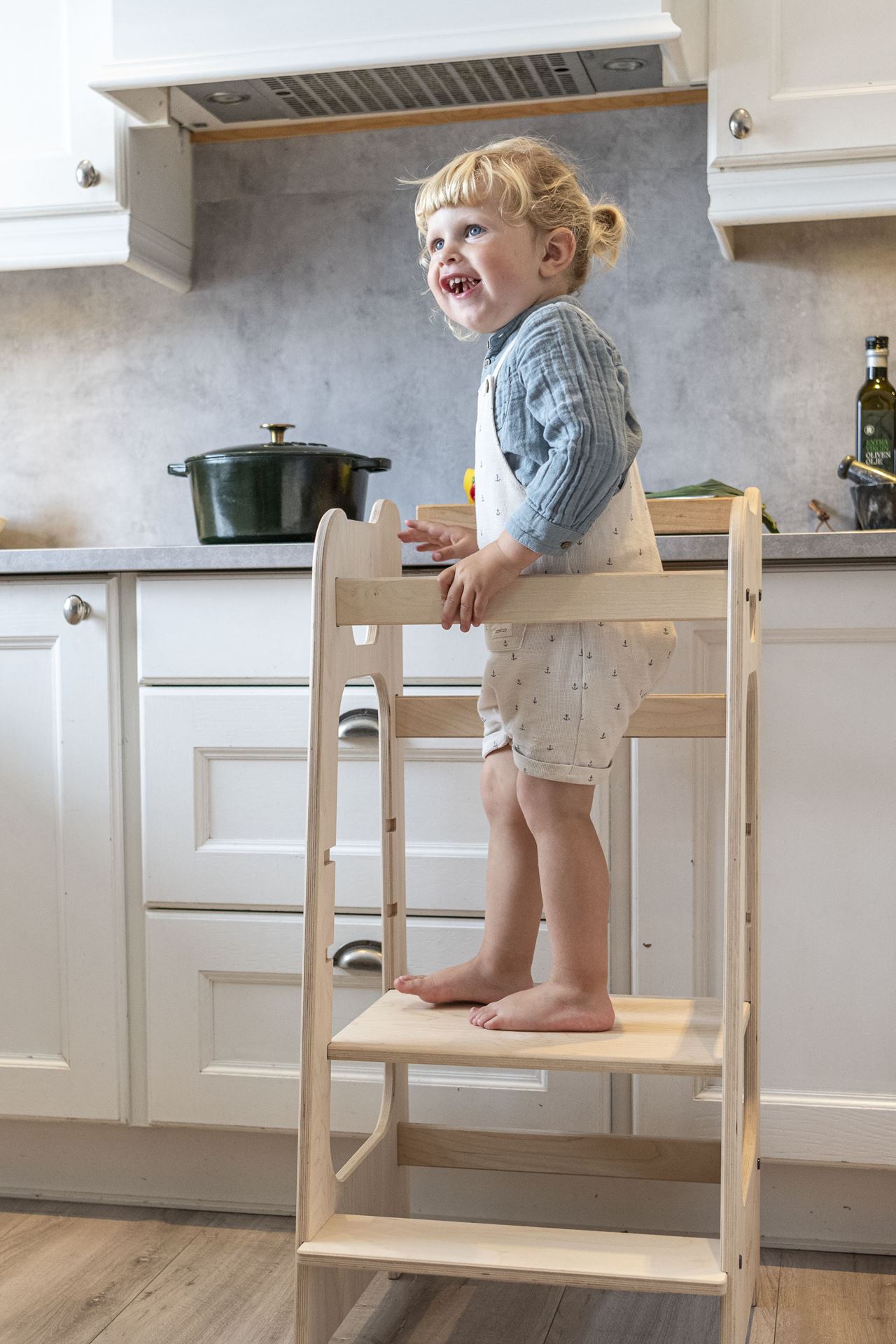 Kjøkkenhjelperen har perfekt høyde for å hjelpe barnet å nå kjøkkenbenken på en trygg måte. Kan justeres i 3 høyder og vokser med barnet og lærer dem å rekke ting selv - passer for alle barn!