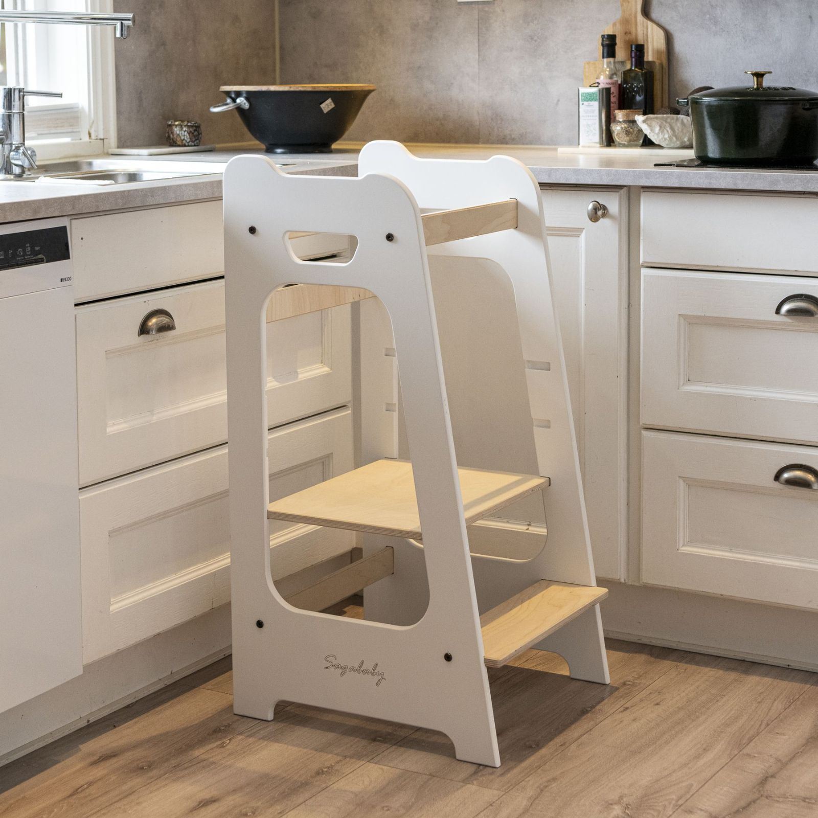Vår Sagababy Kjøkkenhjelper er et montessori læringstårn som kan brukes i hele huset: Når barnet skal finne noe i en høy skuff eller inn i skapet sitt, vil kjøkkenhjelperen hjelpe ved å trene barnet i å gjøre ting selvstendig.