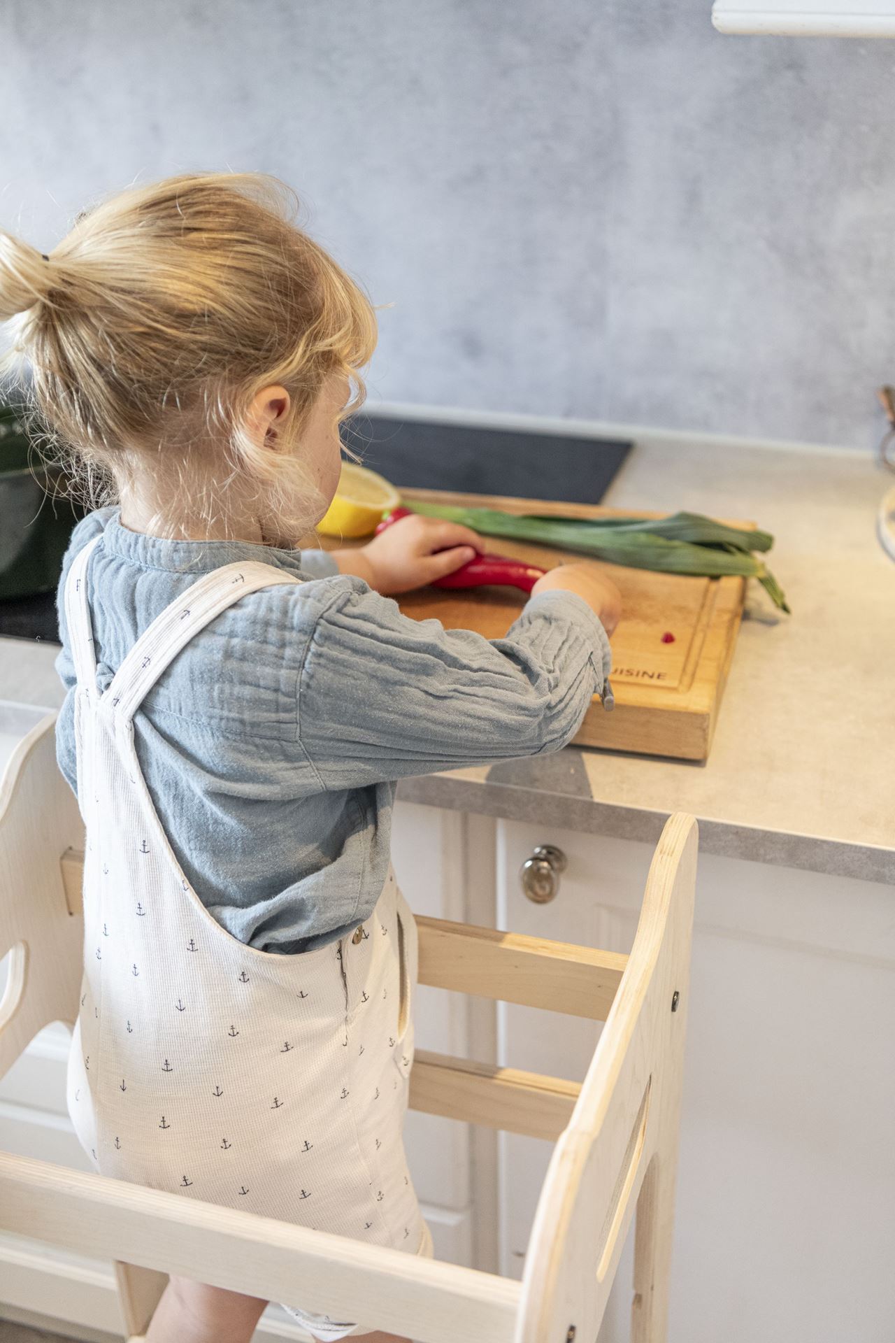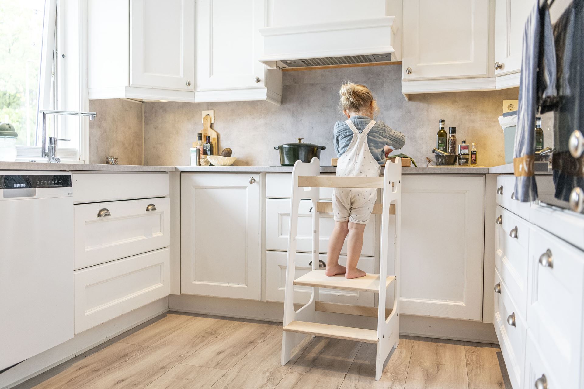 Kjøkkenhjelperen har perfekt høyde for å hjelpe barnet å nå kjøkkenbenken på en trygg måte. Kan justeres i 3 høyder og vokser med barnet og lærer dem å rekke ting selv - passer for alle barn!
