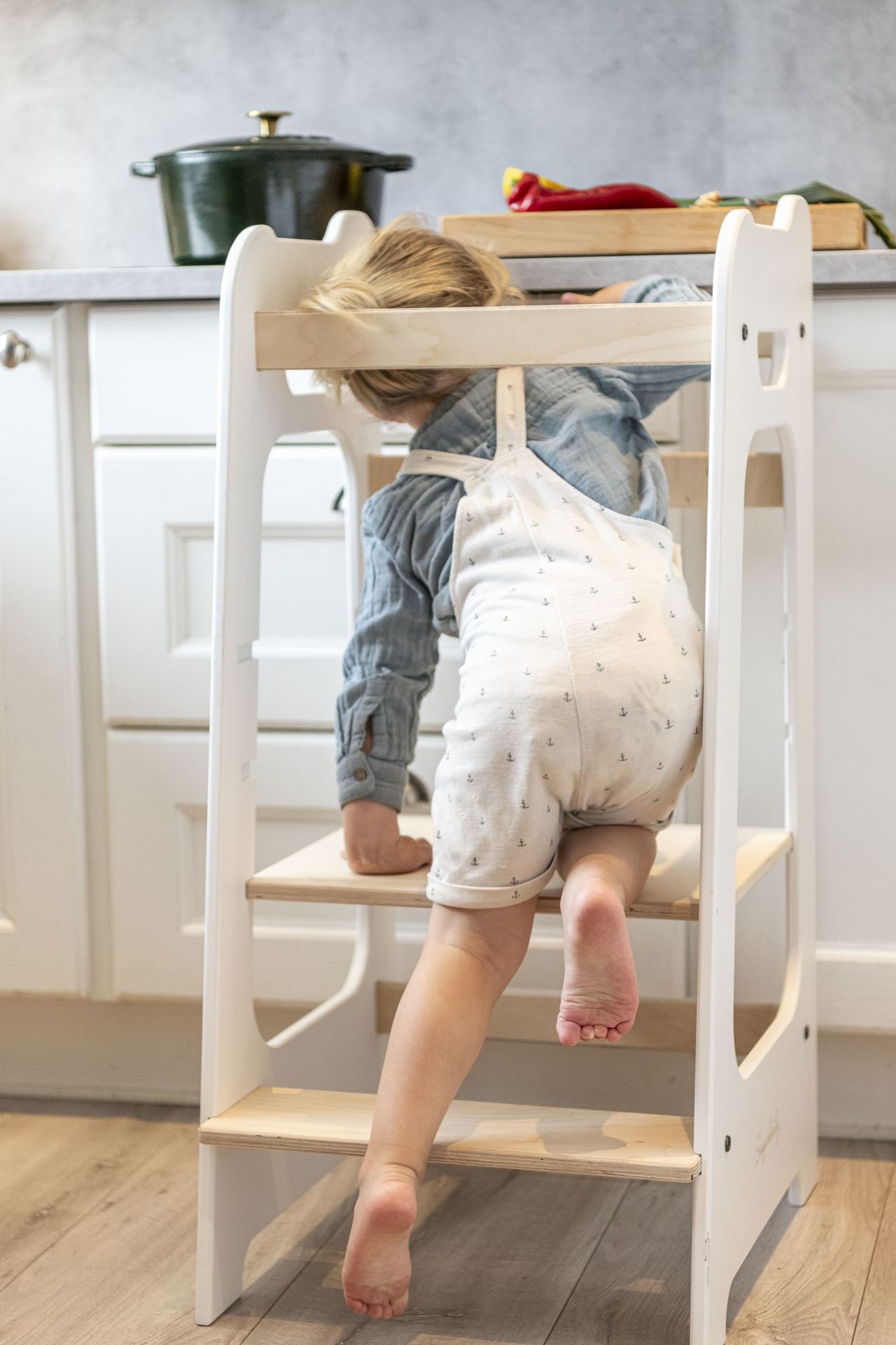 - Kjøkkenhjelper (learning tower / kitchen tower / montessori tower), som kan justeres i tre ulike høyder