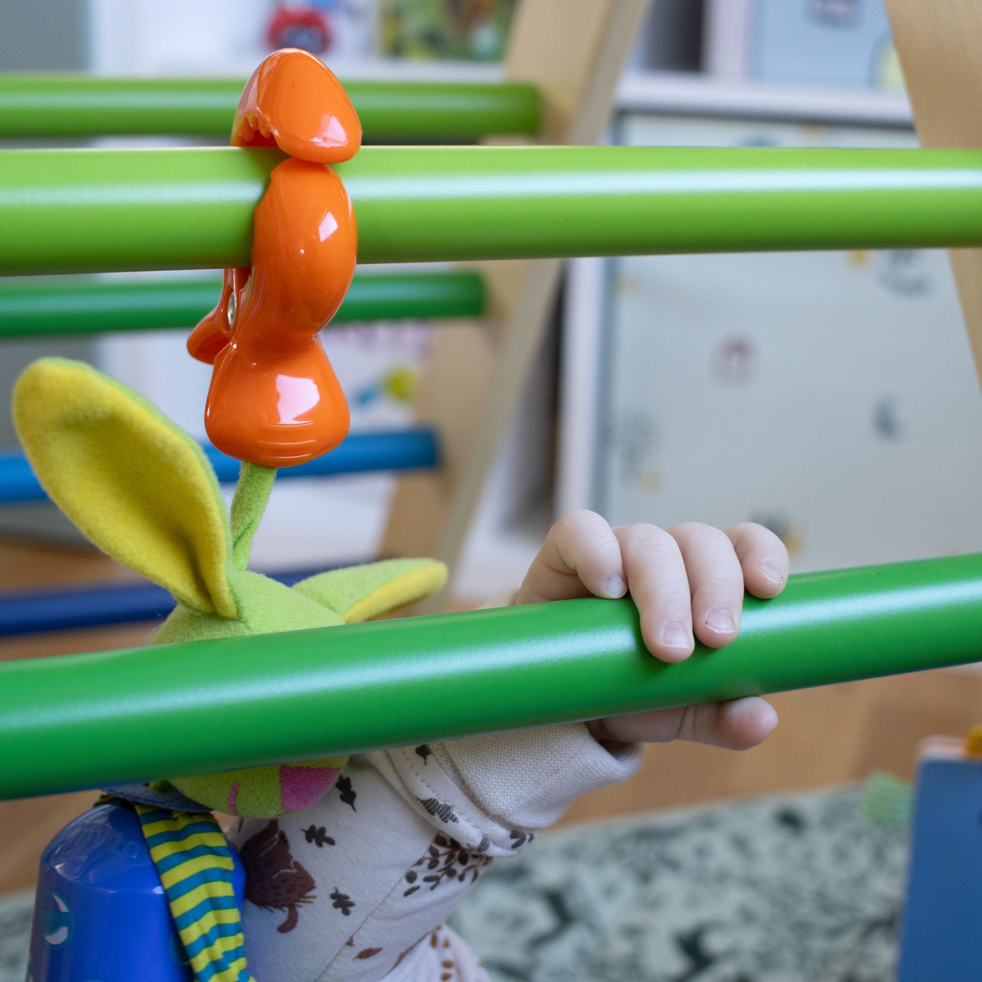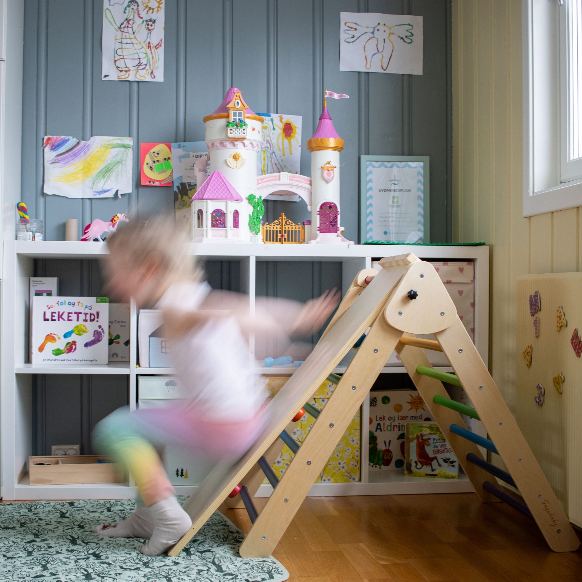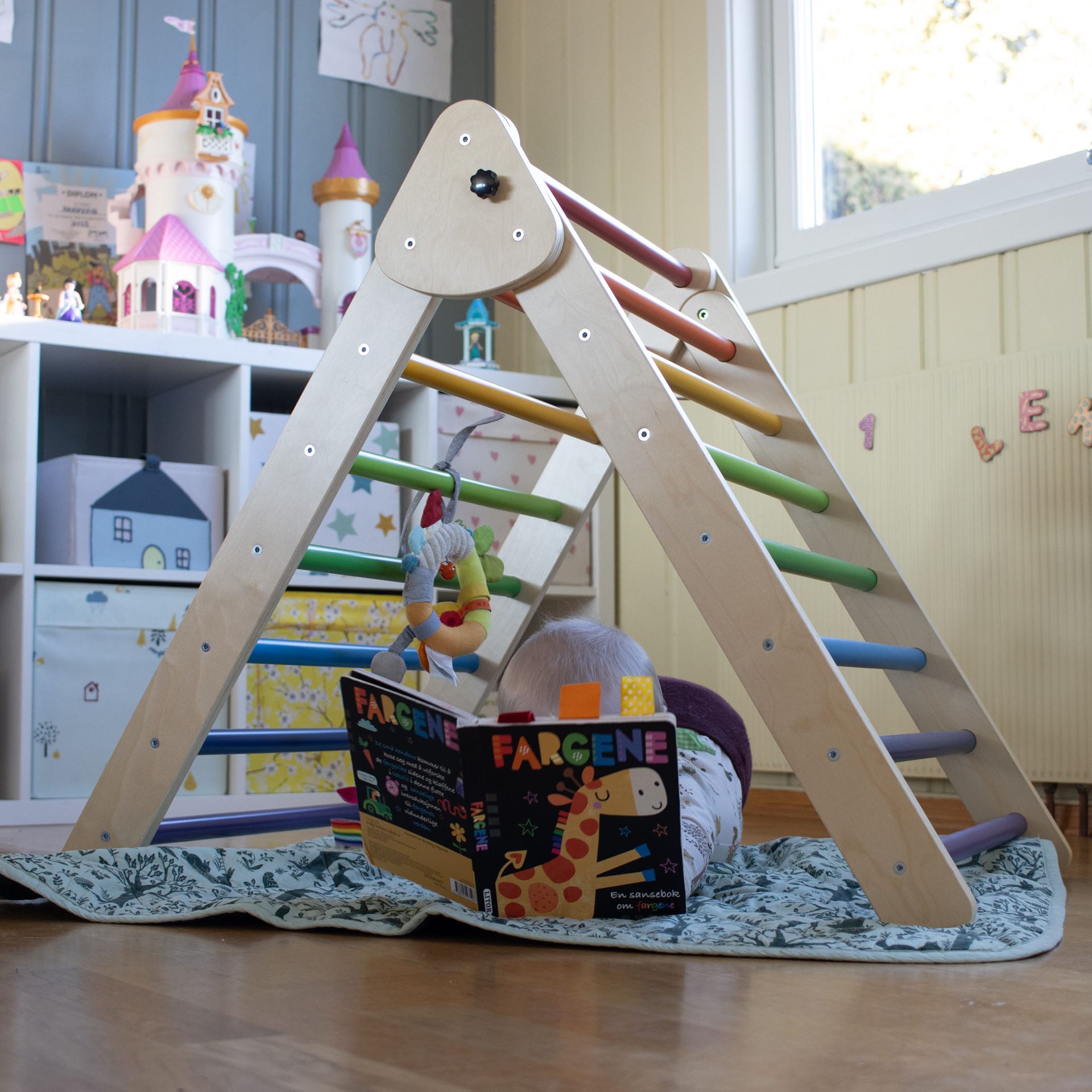 Montessori klatretriangel laget i regnbuefarget treverk. Dette populære klatrestativet utvikler barnets motoriske sanser og fantasi, og vil raskt bli en favoritt på lekerommet.