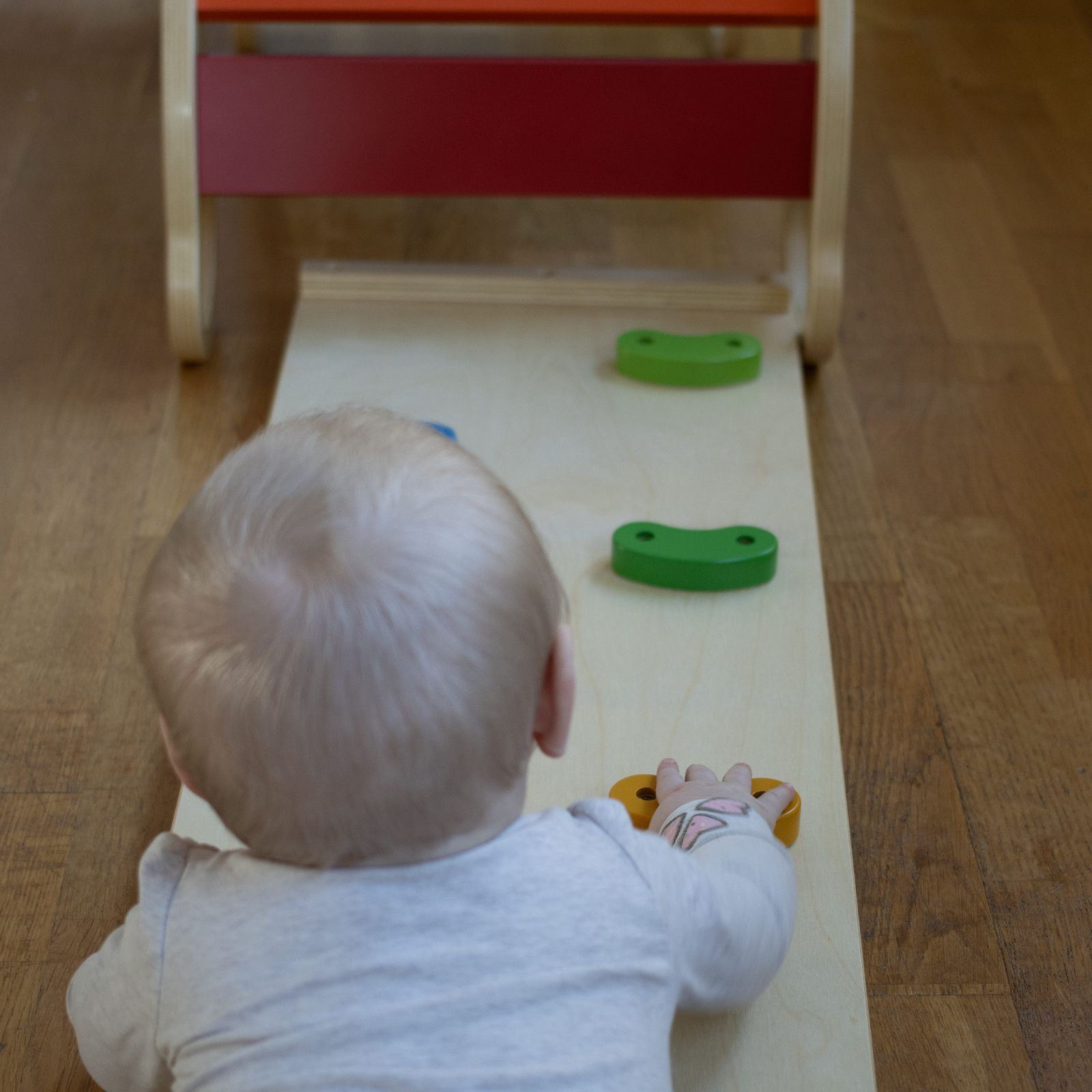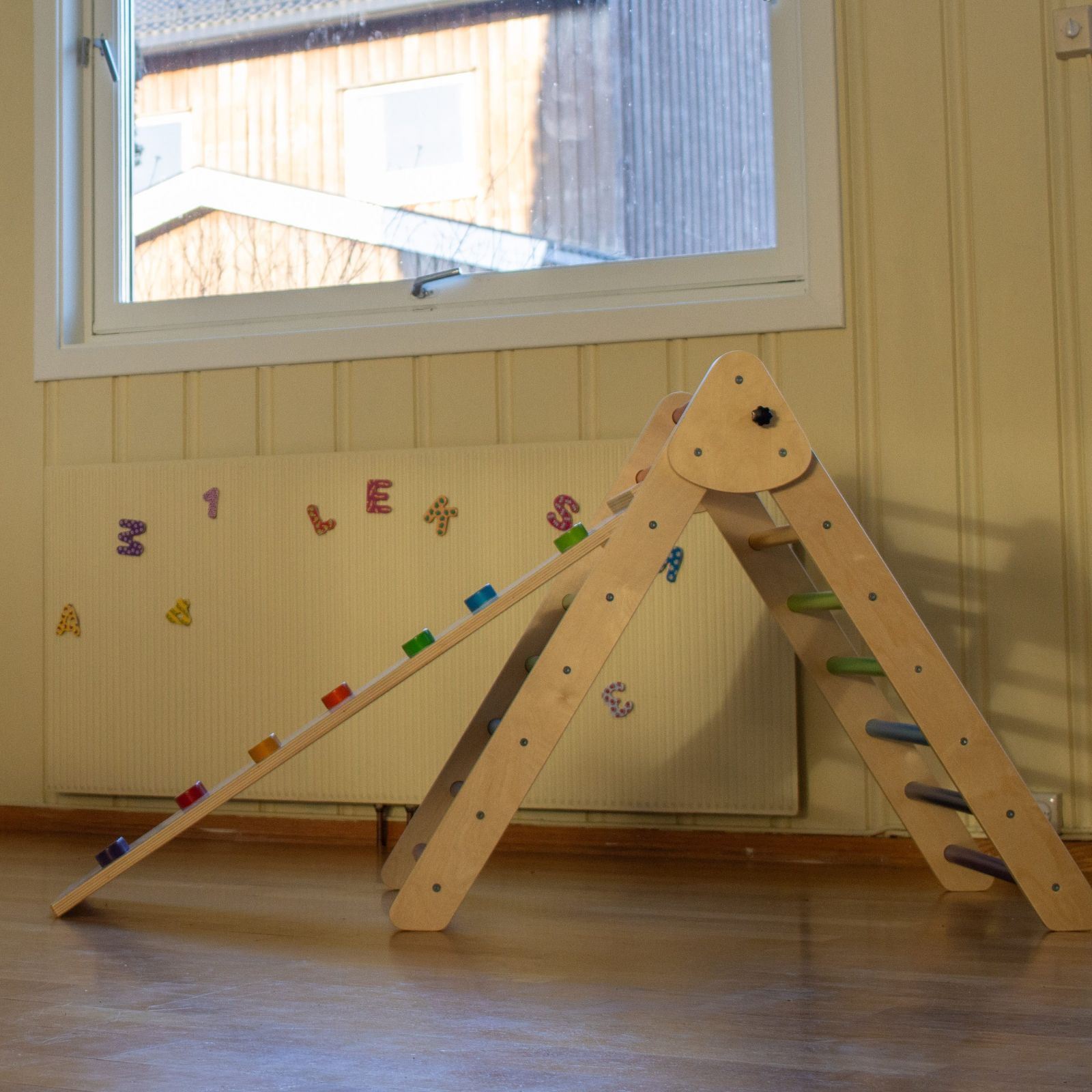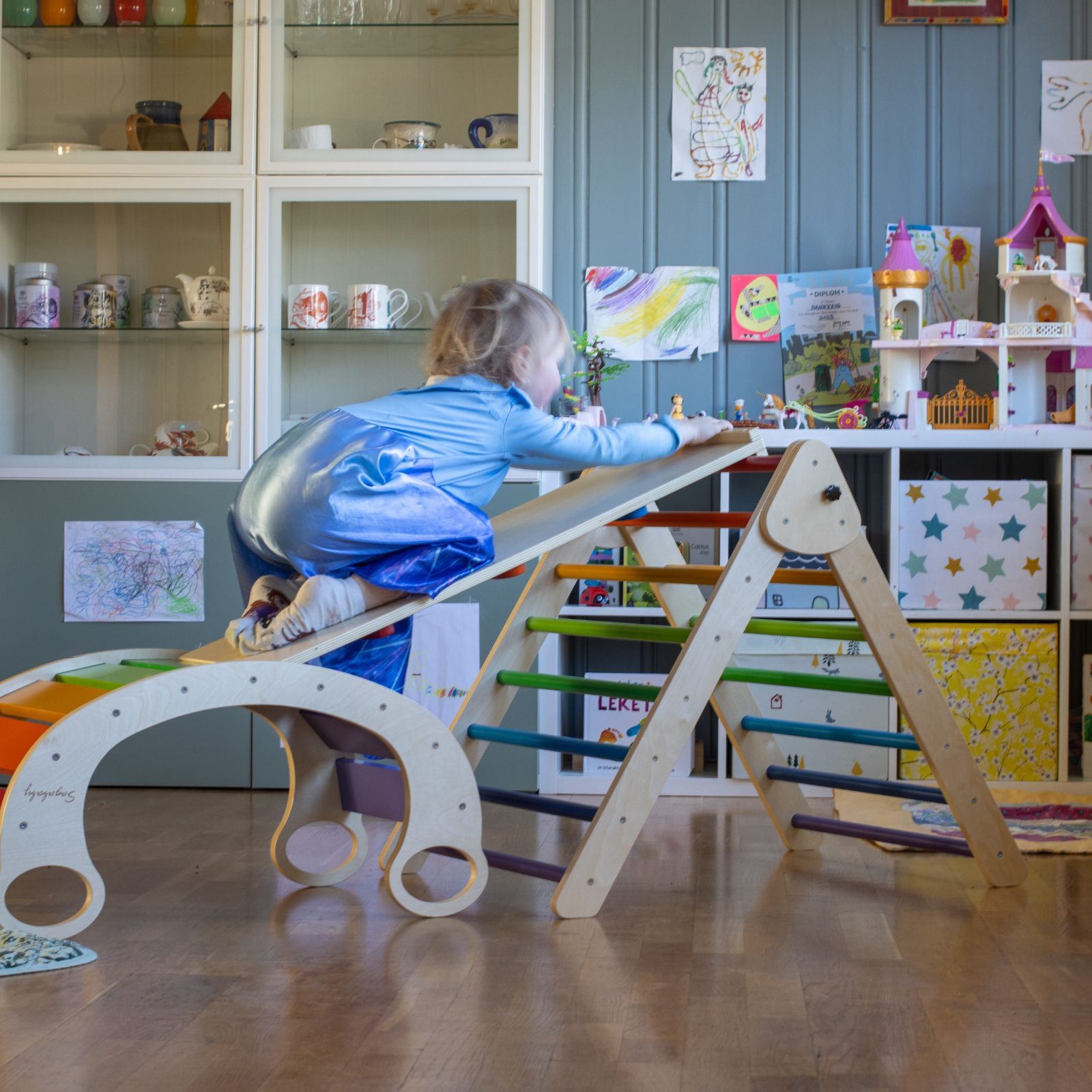 Klatresklie til Sagababy Klatrestativ. På den ene siden er det klatregreb, mens det på andre siden er glatt slik at du kan bruke den som sklie. Kan også brukes som bro mellom to stativer