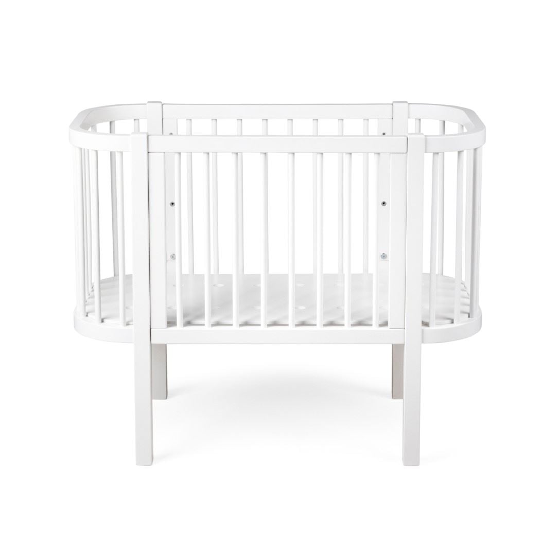 Bedside Crib er inspirert av den ikoniske Sebra-sengen, med buet treverk og slanke lameller som gir et tidløst og nordisk uttrykk. Sengen kan justeres i fem høyder for å passe ulike sengemodeller, og den solide konstruksjonen i bøketre sikrer stabilitet og lang levetid. Med madrassmål 85 x 40 cm får babyen en trygg og komfortabel soveplass fra første dag.