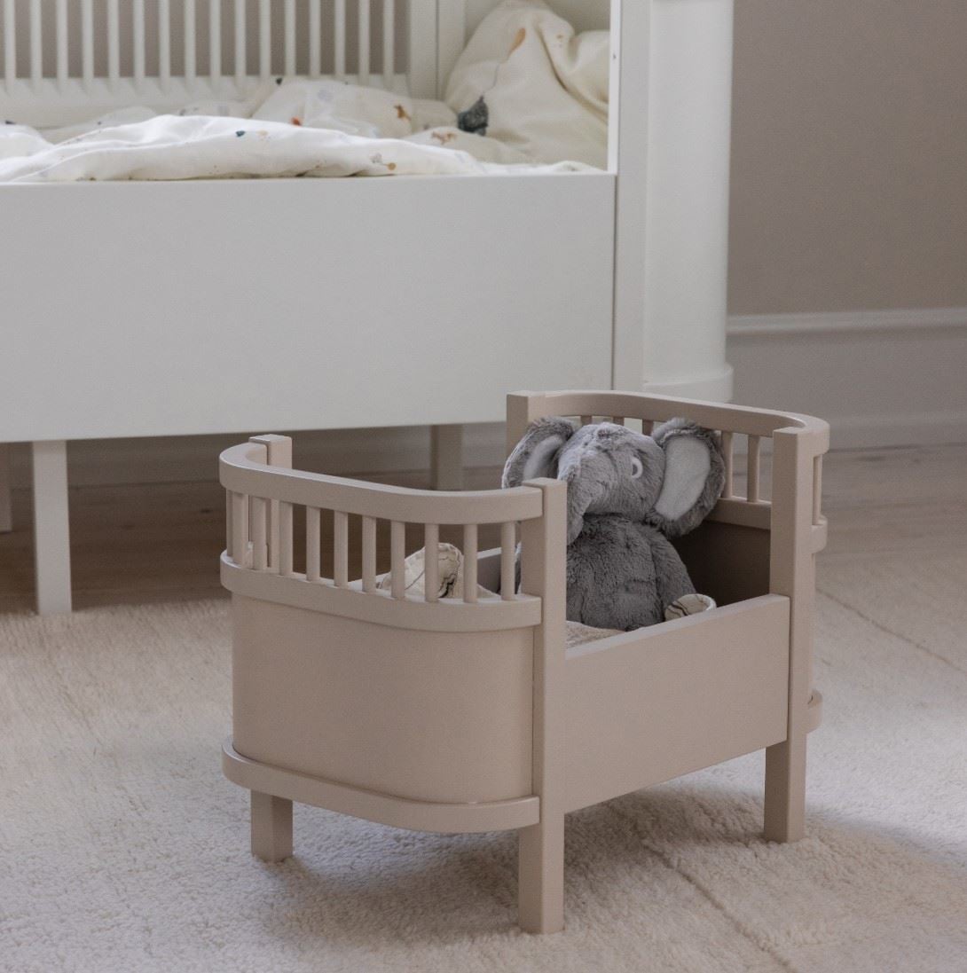 Den er designet med avrundede hjørner og stenger, slik at dukker og bamser kan legges i en seng som ser akkurat ut som barnets egen – en fin detalj som skaper fortrolighet og glede for de små. Sengen er solid bygget av sertifisert tre og passer for barn fra 1 år og oppover.