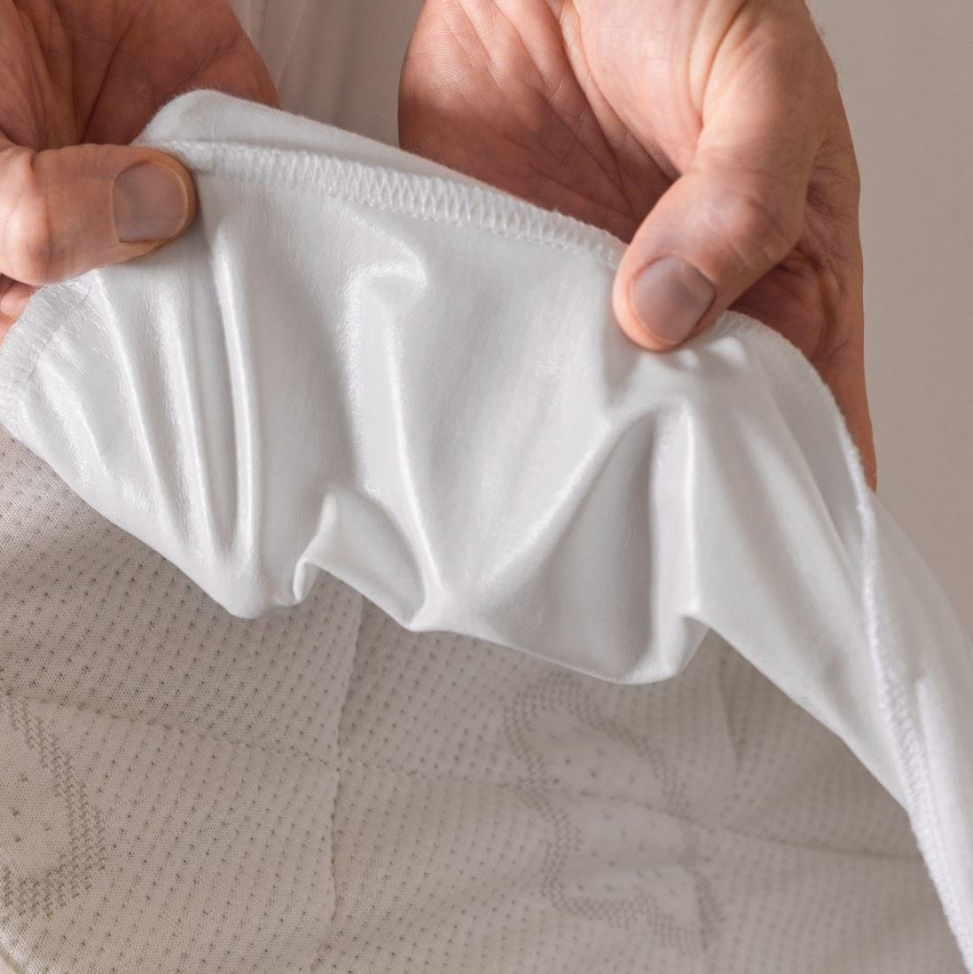 - Materiale: 100% økologisk bomull (topp), PU-membran (bakside)