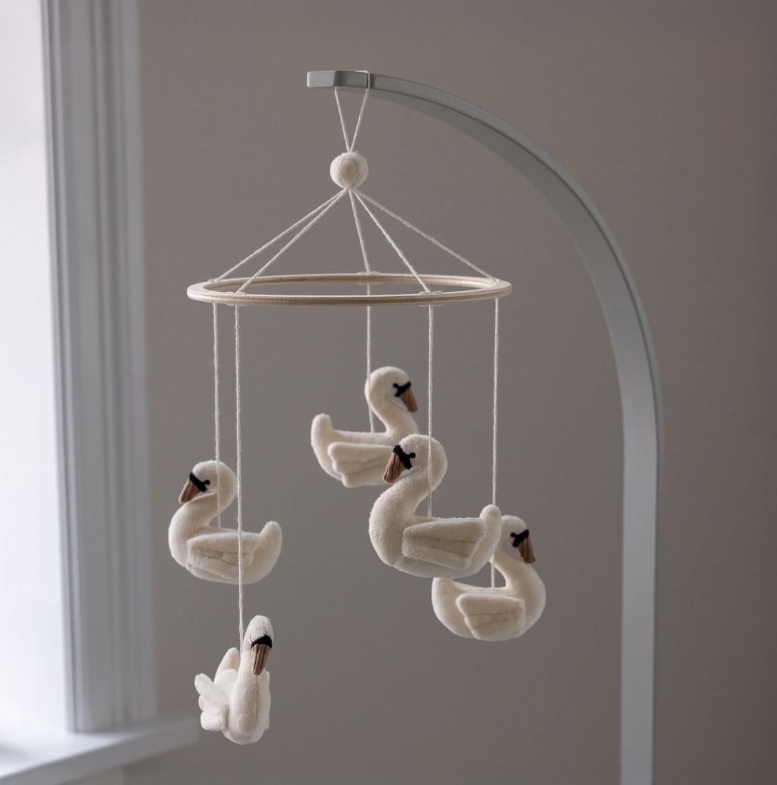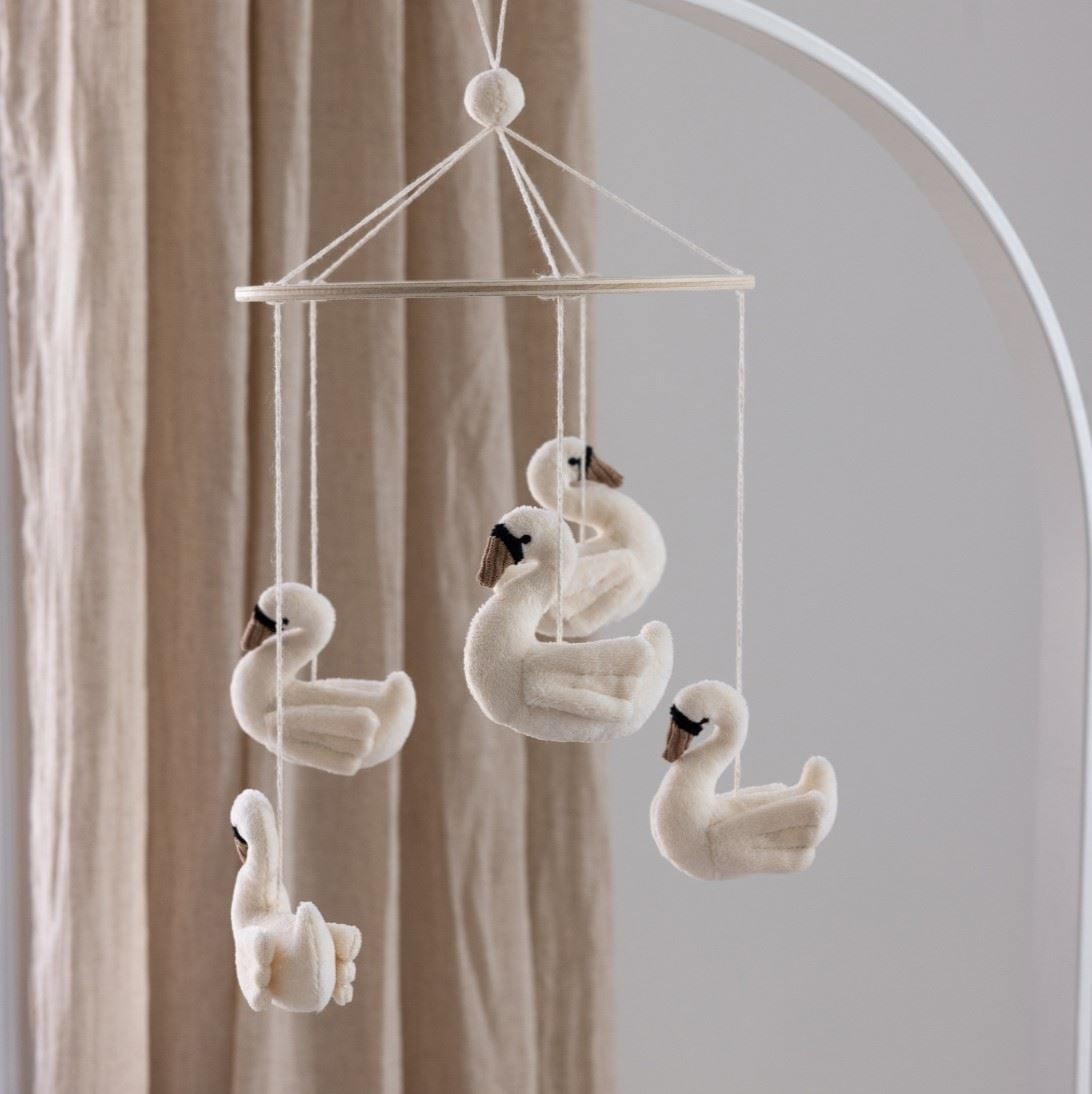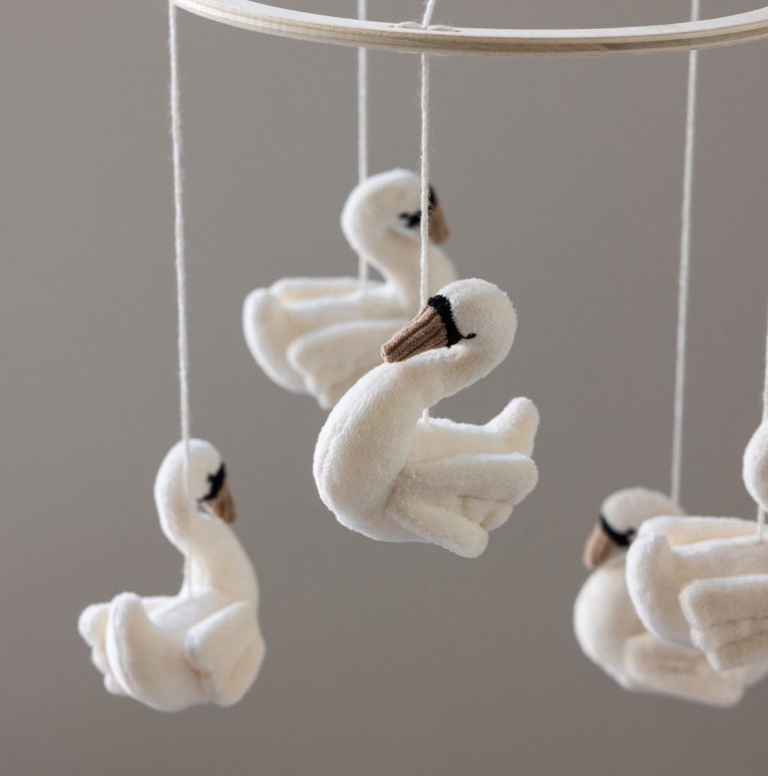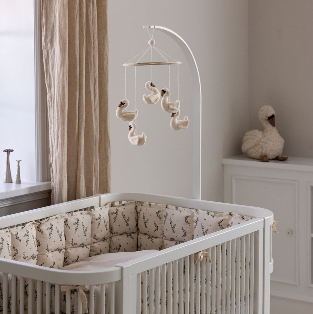 Sebra Uro Svane Creamy White er en vakker og minimalistisk uro med fem myke svaner som svever i ulike høyder fra en delikat trering. Den rolige bevegelsen og det enkle uttrykket skaper en beroligende atmosfære over babysengen, bedside crib eller stelleplassen. Uroen fanger babyens oppmerksomhet og stimulerer synssansen på en trygg og behagelig måte.