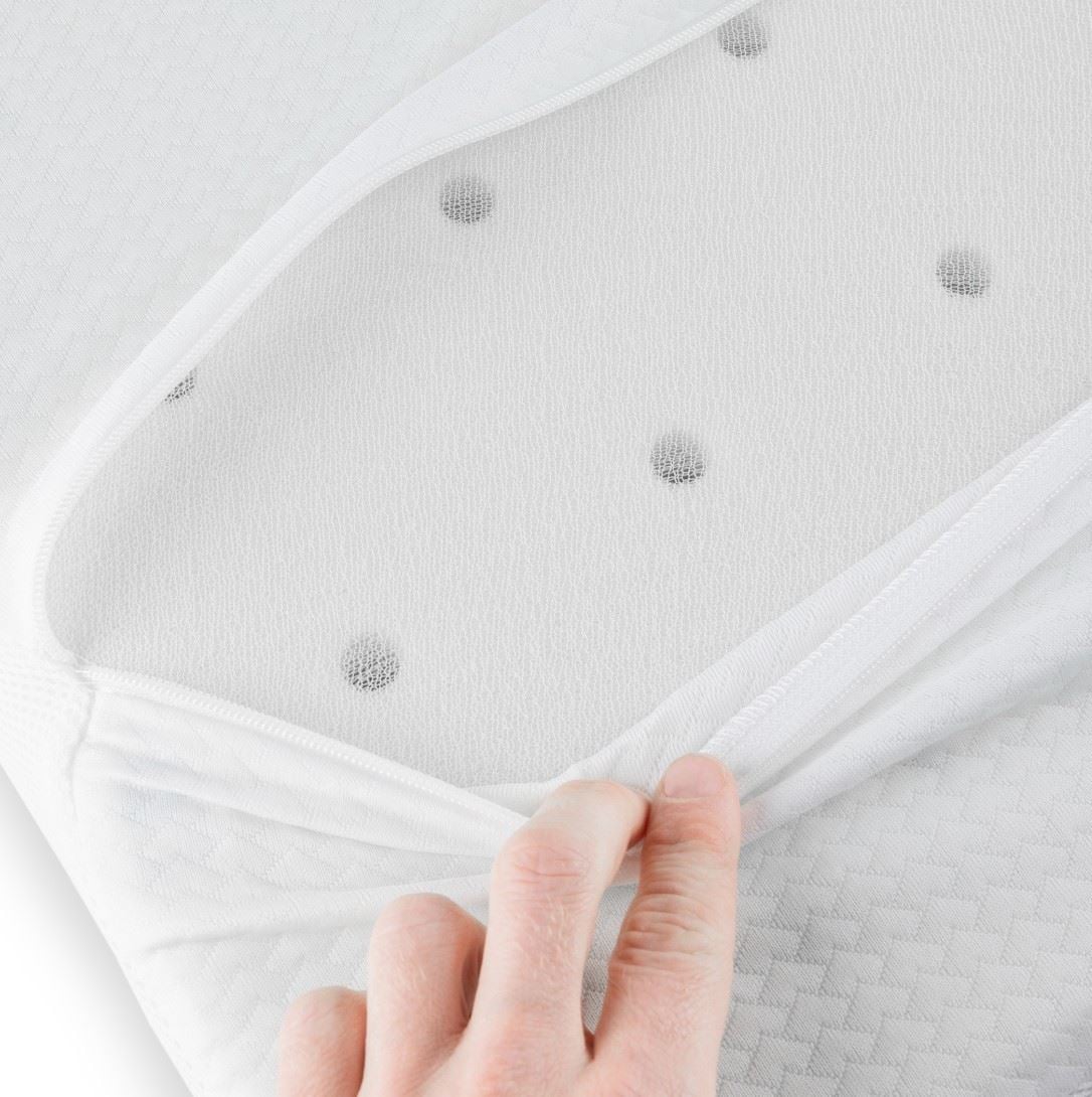 Trekket er mykt og laget av hurtigtørkende polyester og TENCEL™. TENCEL™ består av naturlige fibre som absorberer fuktighet og bidrar til å regulere luftfuktigheten mens barnet sover. Kombinasjonen av disse to materialene sikrer et komfortabelt sovemiljø med en ideell temperatur.