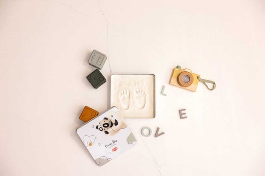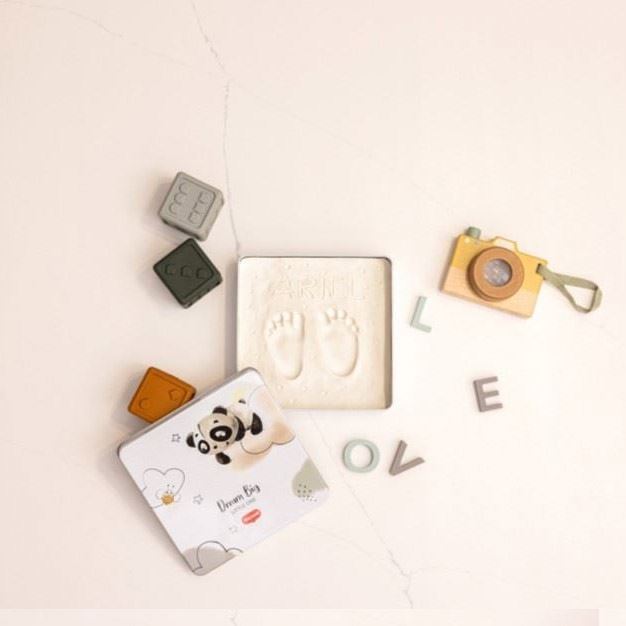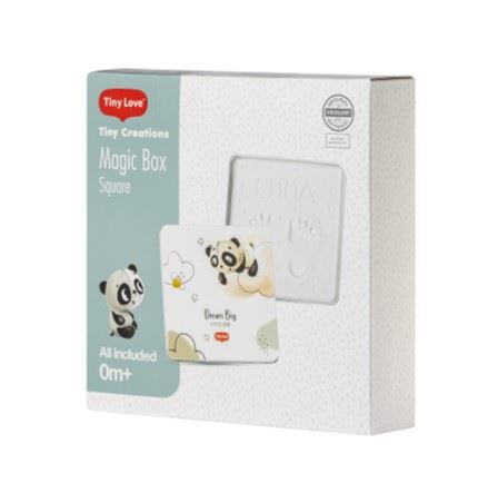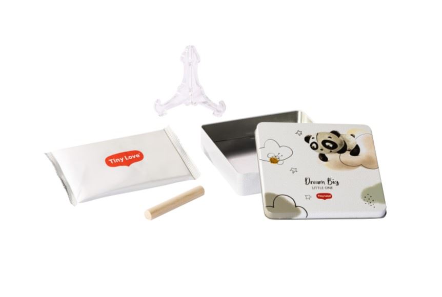 Bevar minnene fra babyens første tid med Tiny Love Magic Box. Lag gipsavstøp av hånd eller fot i trygg, giftfri og dermatologisk testet leire - i en elegant metallboks: et varig minne eller gave.
