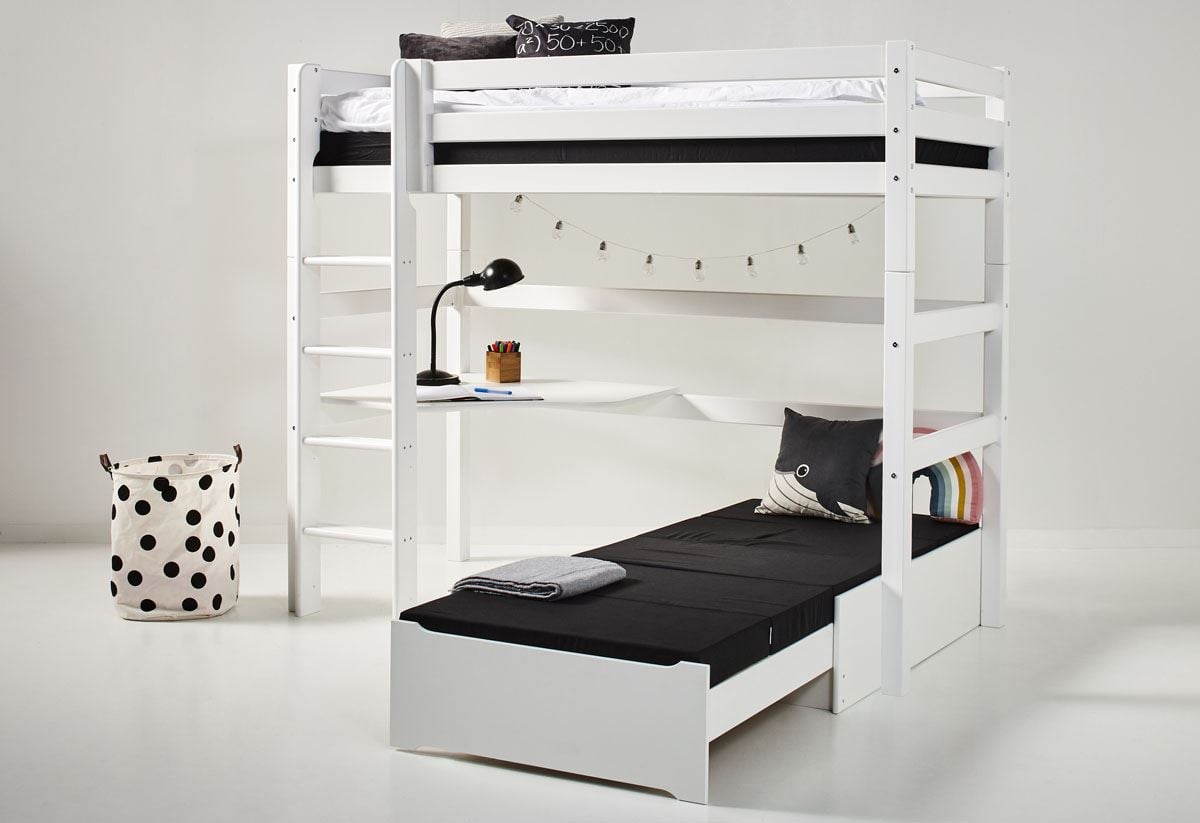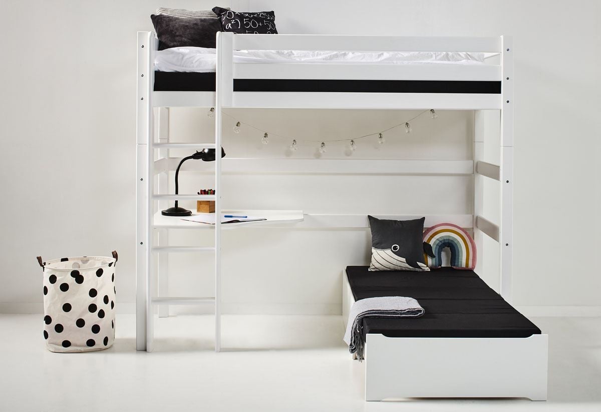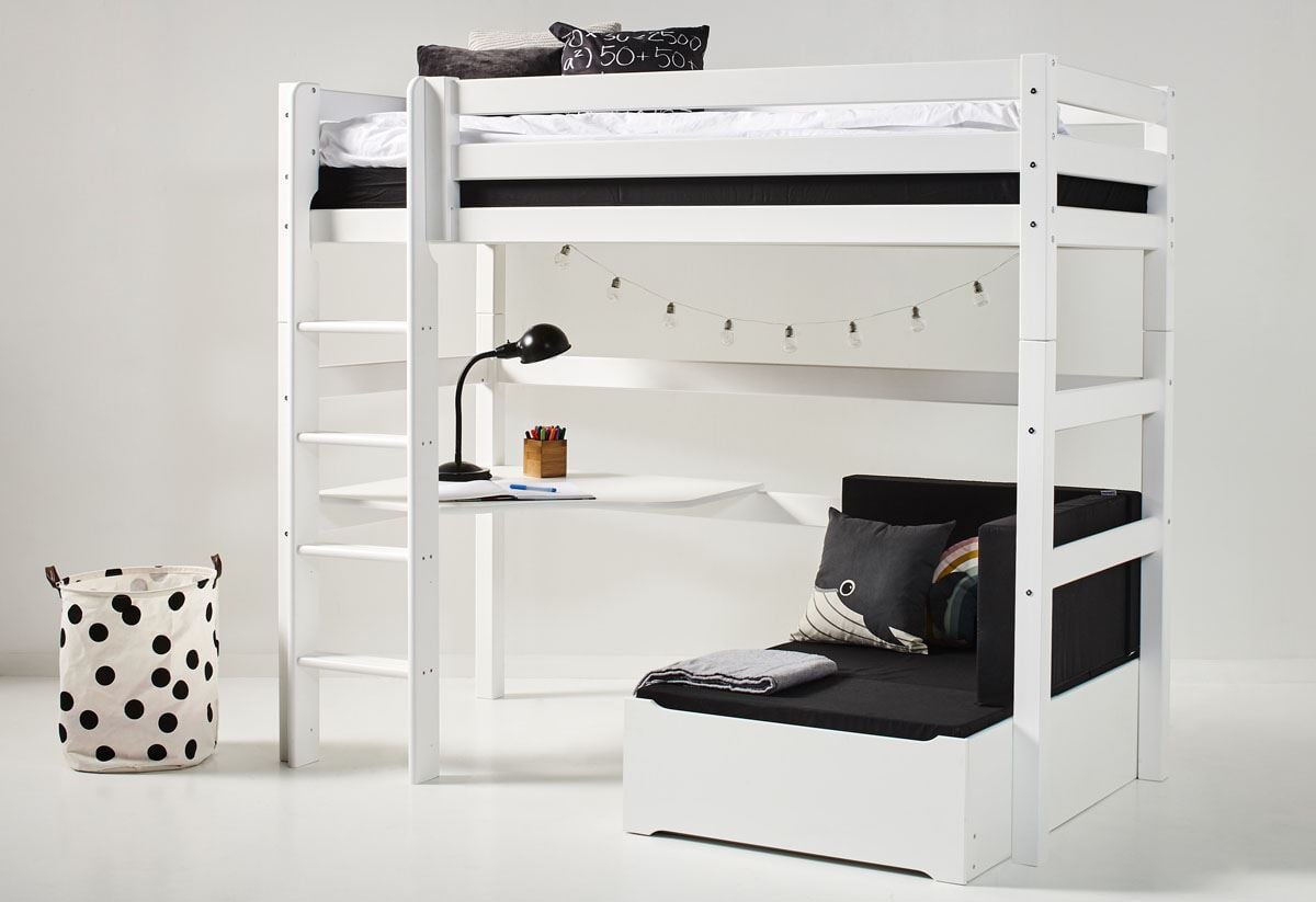 Under sengen er det ekstra gulvplass så barnet kan innrede lounge-område, arbeidsplass, oppbevaring eller plass til lek. Det er hele 135 cm fra undersiden av køyen til gulvet, så kun fantasien setter grenser for hva man kan bruke plassen til.