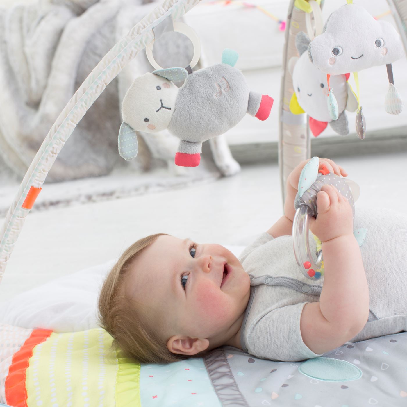 Skip Hop Silver Lining er en herlig og myk babygym i farger som passer bra med moderne innredningstrender. Leveres med lekebøyle med fem søte leker som engasjerer barnet. Her kan barnet utforske leker med lys, lyd og musikk mens det ligger komfortabelt på det myke leketeppet! Størrelse: Mål: 91 x 91 x 48 cm.
