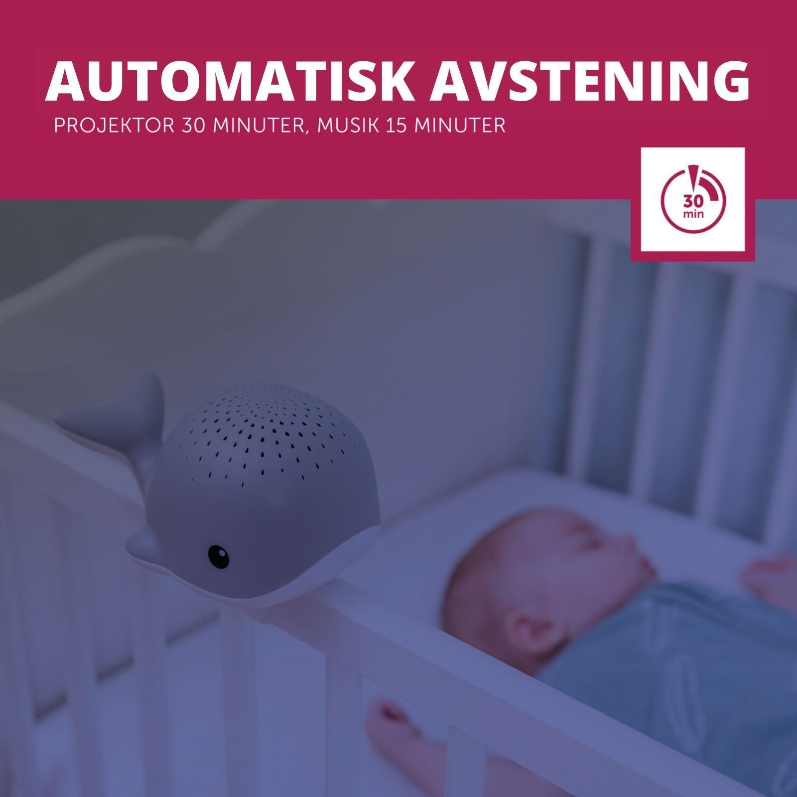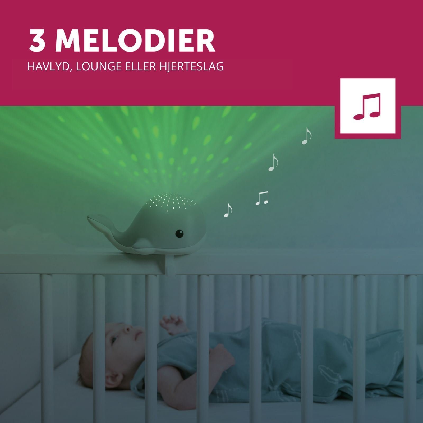 - Gråtesensor aktiverer lys og lyd automatisk